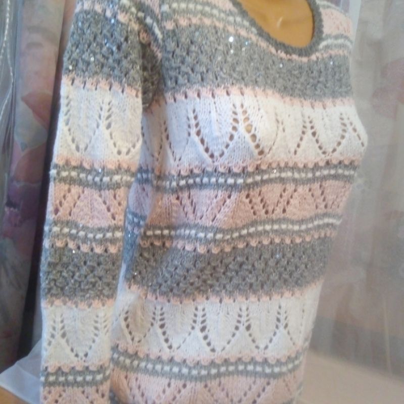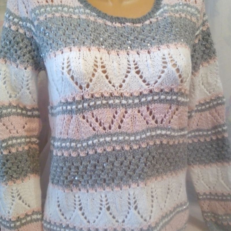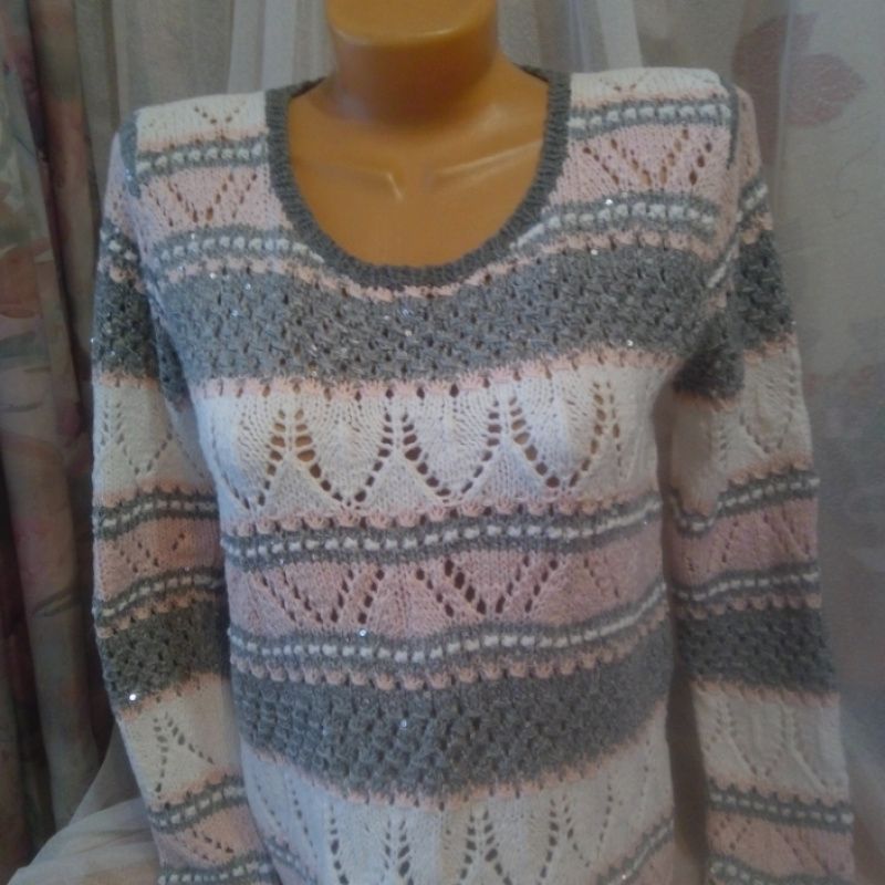 Легкий женский свитерок с пайетками в красивом сочетании серого, белого и розового цветов