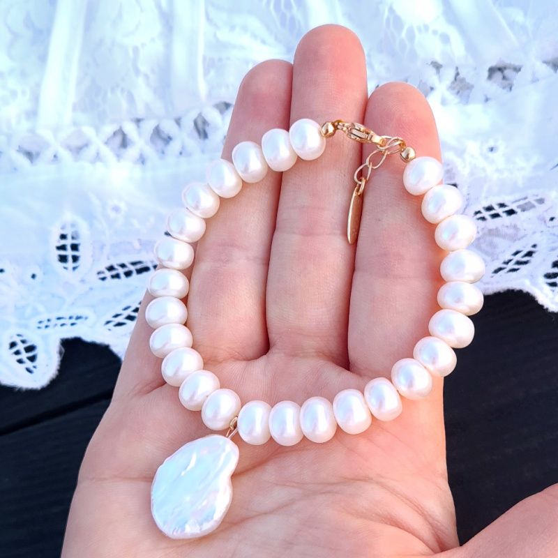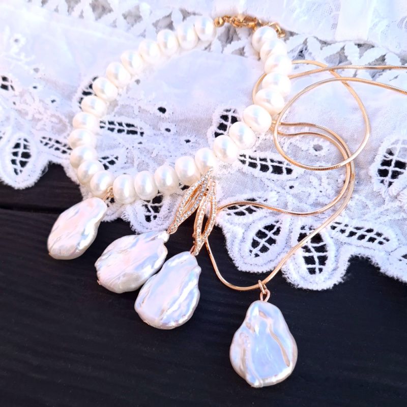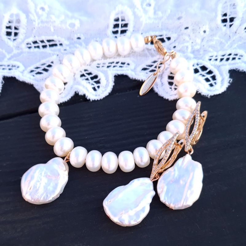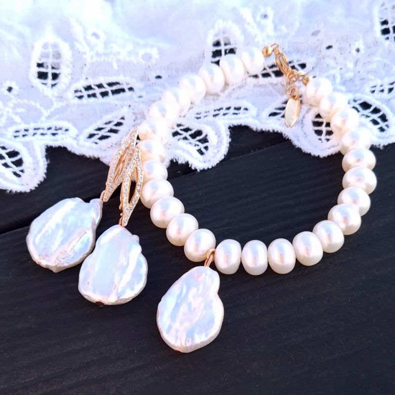 Свадебный или праздничный комплект украшений: браслет и серьги из натуральных белого жемчуга и жемчуга Кейши в качественной позолоте. Жемчужины Кейши невероятно красивые, фактурные, светятся естественным блеском и разными оттенками цветов. Украшения выглядят роскошно и стильно. Металл: позолота по латуни, медицинский сплав, не вызывает аллергии или раздражения. Размер жемчужин в браслете: 8-7 мм (по центру - крупные, по краям - меньше). Размер жемчужин Кейши: 22х18 мм Стоимость указана за комплект, где длина браслета до 18 см и серьги. На других фото является кулон на цепочке, не входит в стоимость, но может быть заказан отдельно. Вы можете заказать кулон, или ожерелье на 1, 2 или 3 ряда жемчуга в комплект. Также можно заказать похожий комплект в серебре 925 пробы.
