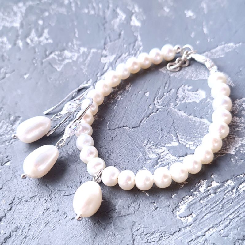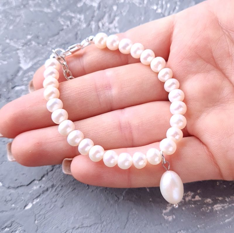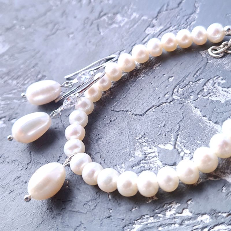Комплект: браслет и серьги из натурального жемчуга высокого класса, с большой натуральной жемчужиной подвеской в форме капли - прекрасный подарок для вашей подруги, жены, мамы, сестры в день рождения, день влюбленных, 8 марта. Размер жемчужин в браслете: 6-5 мм (по центру - крупные, на концах - меньше). Размер жемчужин капель 11-12 мм. Застежки сережек медицинская сталь, с кристаллами циркона. Длина браслета согласуется с покупателем, и регулируется с помощью удлинительного цепочки. В браслет установлена обычная металлическая застежка. По желанию: застежка и удлинитель млже быть сделан в серебре 925 пробы +150 грн. Также в комплект к браслету могу сделать ожерелье и кристаллов. На последнем фото есть праздничный футляр из натурального дерева, который не входит в стоимость, но может быть заказан отдельно.
