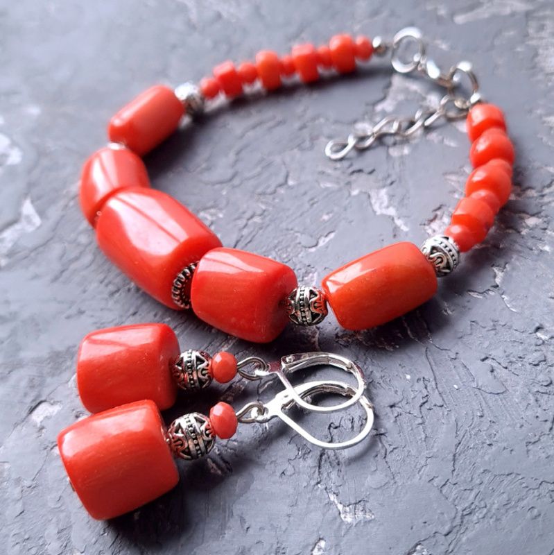 Браслет и серьги с натуральными кораллами цвета лосось и хрустальными граненого бусинками в тон к коралла. Этот оттенок использовался в старинных кораллах, поэтому, при создании этого комплекта был избран минималистичный дизайн "под старину". Длина браслета - на вашу руку (согласуется после оформления покупки). Застежки сережек - серебро 925 пробы. Длина сережек: 38 мм. Есть продажа украшений отдельно. В комплект могу сделать колье или кулон на цепочке в аналогичном стиле по вашим пожеланиям. На последнем фото есть праздничный футляр из натурального дерева, который не входит в стоимость, но может быть заказан отдельно.