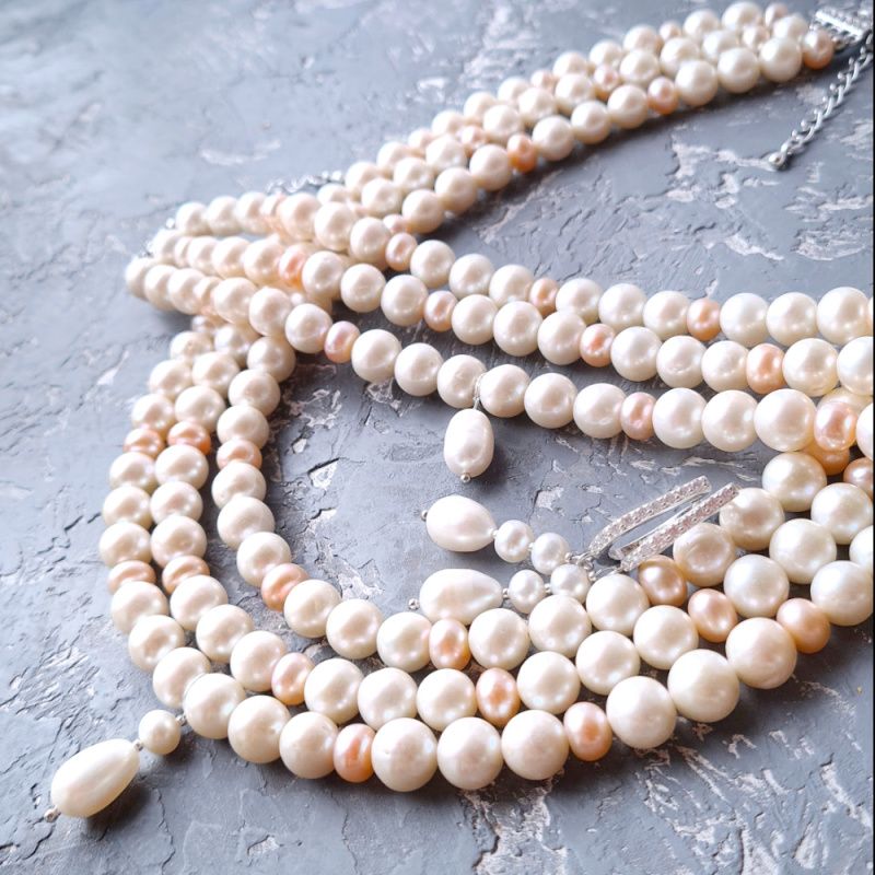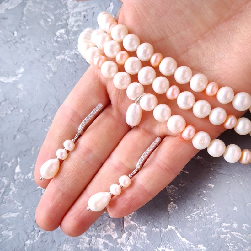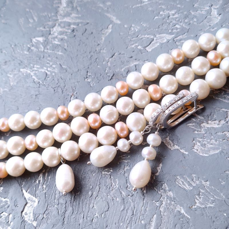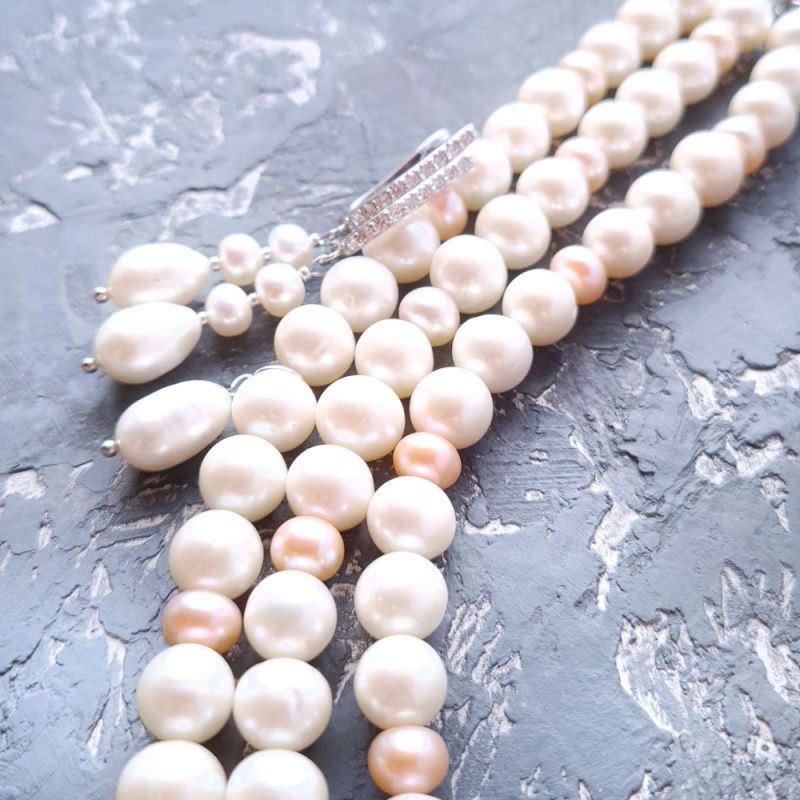 Комплект: трехрядный браслет и серьги из натуральных белого жемчуга (ivory) и персиковых жемчуга, большой натуральной жемчужиной подвеской в форме капли - прекрасный подарок для вашей подруги, жены, мамы, сестры в день рождения, 8 марта или жемчужная свадьба. Размер жемчужин в браслете: 7-6 мм (по центру - крупные, на концах - меньше). Размер жемчужин капель 11-10 мм. Застежки серег: серебро 925 пробы, английский замок, инкрустированные кристаллами циркона. Длина браслета согласуется с покупателем, и регулируется с помощью удлинительного цепочки. В браслет установлена обычная металлическая застежка. По желанию: застежка и удлинитель может быть сделан в серебре 925 пробы +300 грн. На одном из фото также колье, не входит в стоимость и может быть заказано отдельно, такое или иное (на 1, 2 или 3 нити жемчуга). На последнем фото есть праздничный футляр из натурального дерева, который не входит в стоимость, но может быть заказан отдельно.
