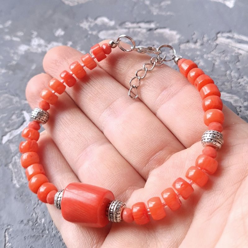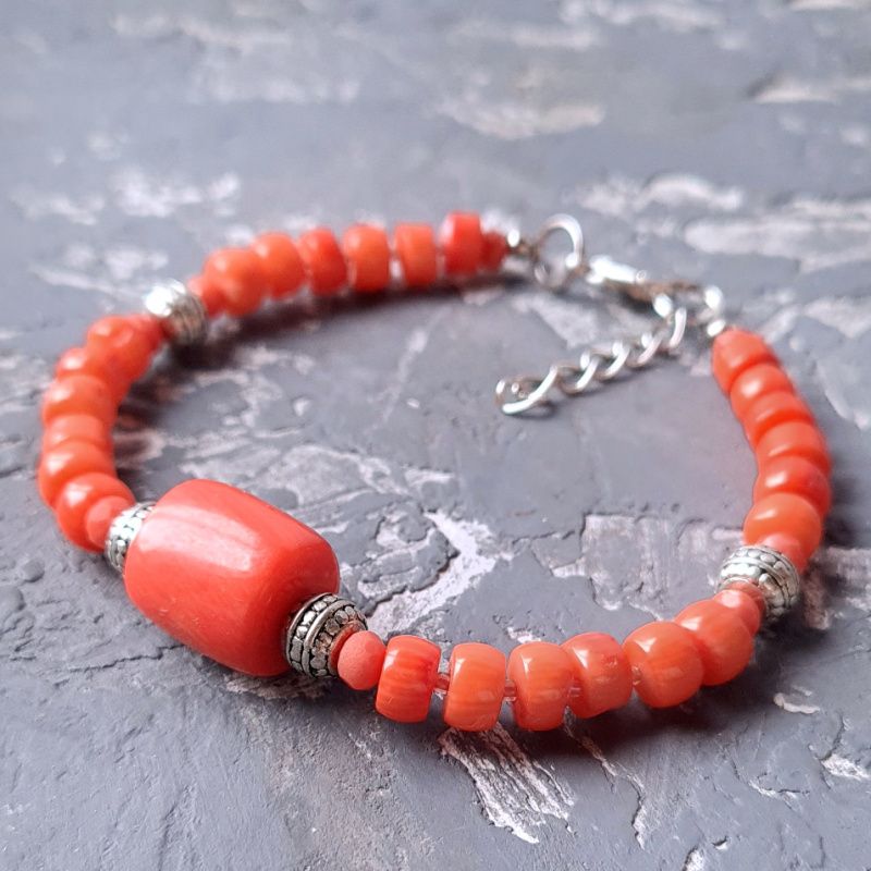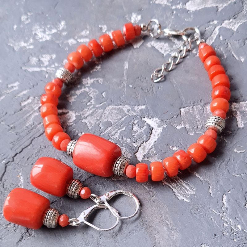 Браслет с натуральными кораллами разных форм и размеров. По центру - большая бусина натурального коралла формы "бочонок". Длина браслета - на вашу руку (согласуется после оформления покупки). На других фото есть серьги, не входящих в стоимость, но также могут быть заказаны в комплекте или отдельно. В комплект могу сделать ожерелье или кулон на цепочке по вашим пожеланиям. На последнем фото есть праздничный футляр из натурального дерева, который не входит в стоимость, но может быть заказан отдельно.