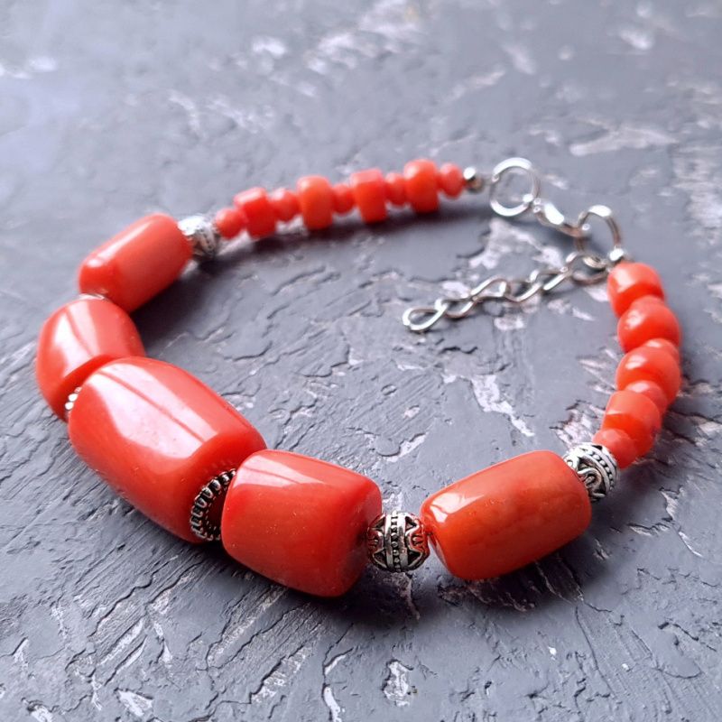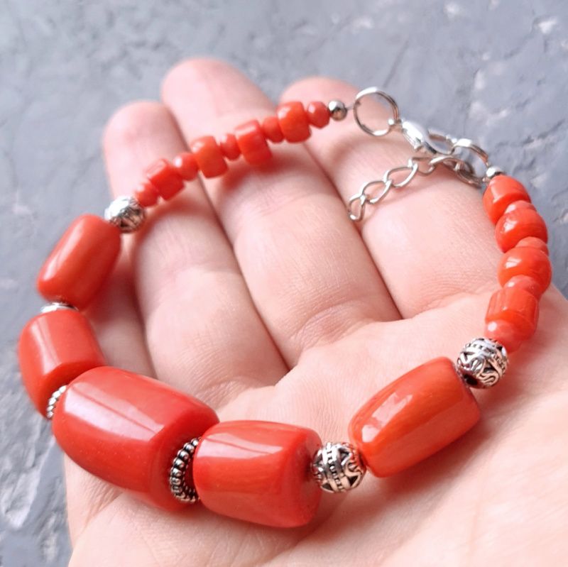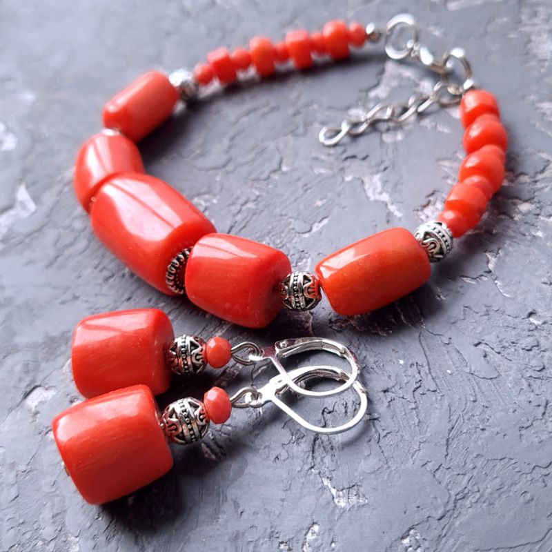 Браслет с натуральными кораллами разных форм и размеров. По центру - большая бусина натурального коралла формы "бочонок". Длина браслета - на вашу руку (согласуется после оформления покупки). На других фото есть серьги, не входящих в стоимость, но также могут быть заказаны в комплекте или отдельно. В комплект могу сделать ожерелье или кулон на цепочке по вашим пожеланиям. На последнем фото есть праздничный футляр из натурального дерева, который не входит в стоимость, но может быть заказан отдельно.