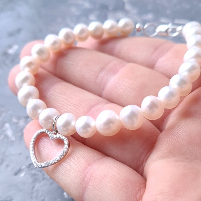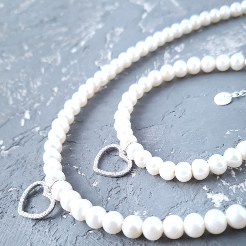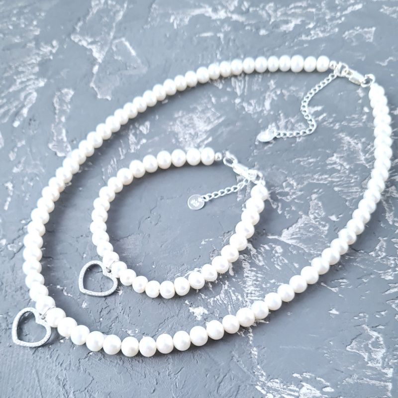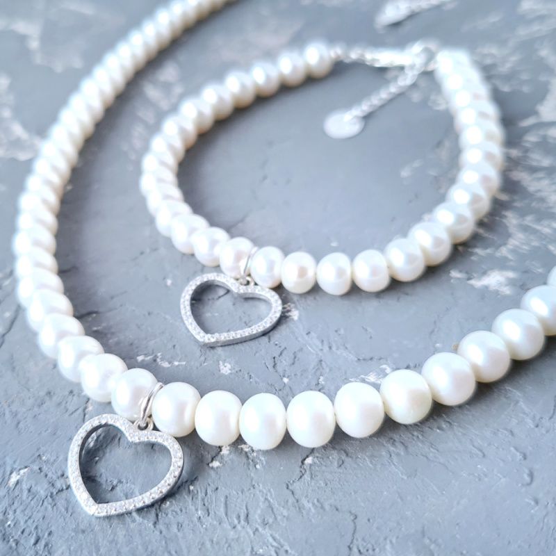 Браслет из натуральных белого жемчуга с подвеской сердце большое. Вся фурнитура в серебре 925 пробы - кулон а также застежка По заказу - любая, нужна вам длина браслета. Стоимость указана за браслет как на фото. Размер жемчужин: 6-5 мм (по центру - крупные, на концах - меньше). Жемчужинки красивые, высокого качества, светятся. На других фото есть колье, не входит в стоимость, но также может быть заказано отдельно. На заказ к браслету также могу зробитисрибни серьги с подобными подвесками в форме сердца. На последнем фото есть праздничный футляр из натурального дерева, который не входит в стоимость, но может быть заказан отдельно.