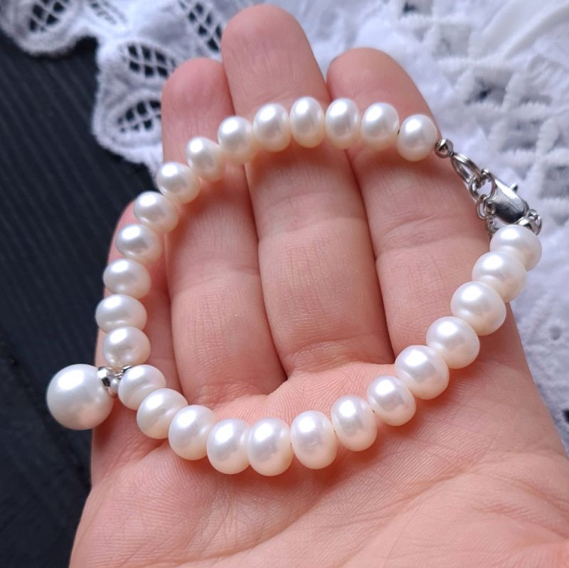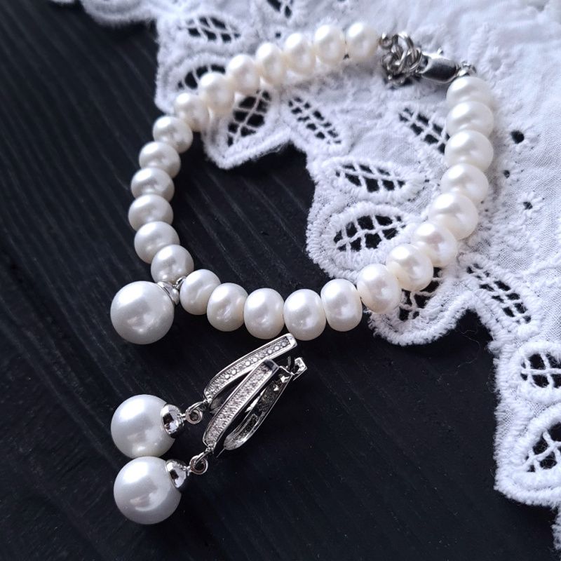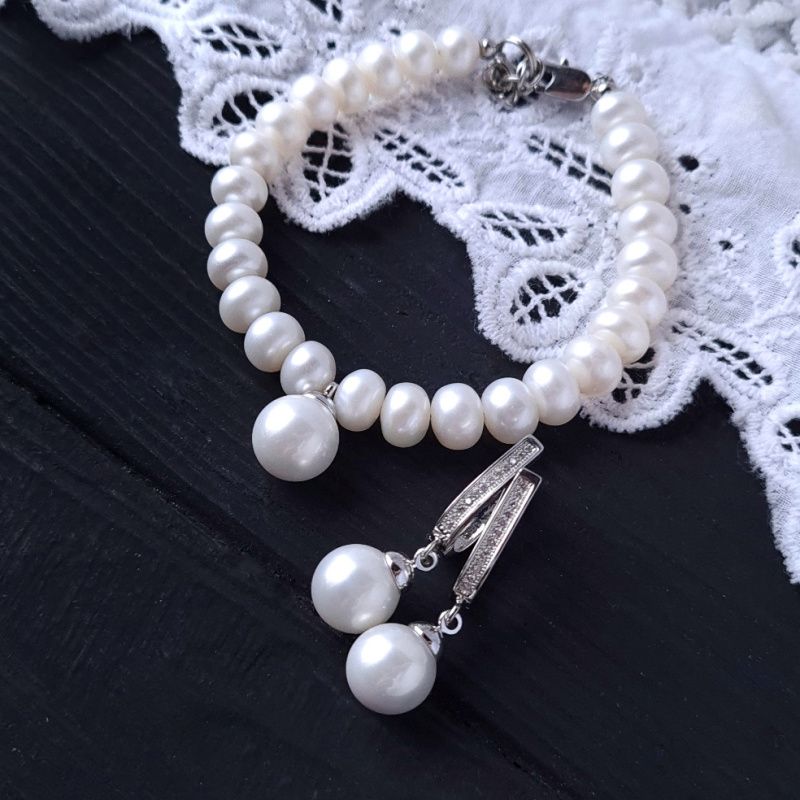 Браслет из натурального жемчуга высокого класса и подвески с жемчужиной Майорка. Размер жемчужин в браслете: 9-8 мм ( по центру более крупные, по краям - меньшие). Жемчужина Майорки в подвеске - это качественный дорогой заменитель натурального жемчуга, изготавливаемый по технологии, приближенной к образованию настоящего жемчуга, с использованием пилки перетертого жемчуга, позволяющий максимально точно воспроизвести цвет и натуральное сияние жемчужин. Поэтому жемчуг Майорки имеет очень близкий к натуральному блеску, цвет и вес. Застежка и бейл в подвеске медицинского сплава. На других фото есть серьги и колье, которые не входят в стоимость, но могут быть заказаны отдельно.