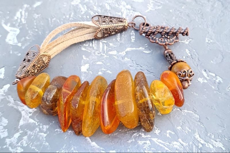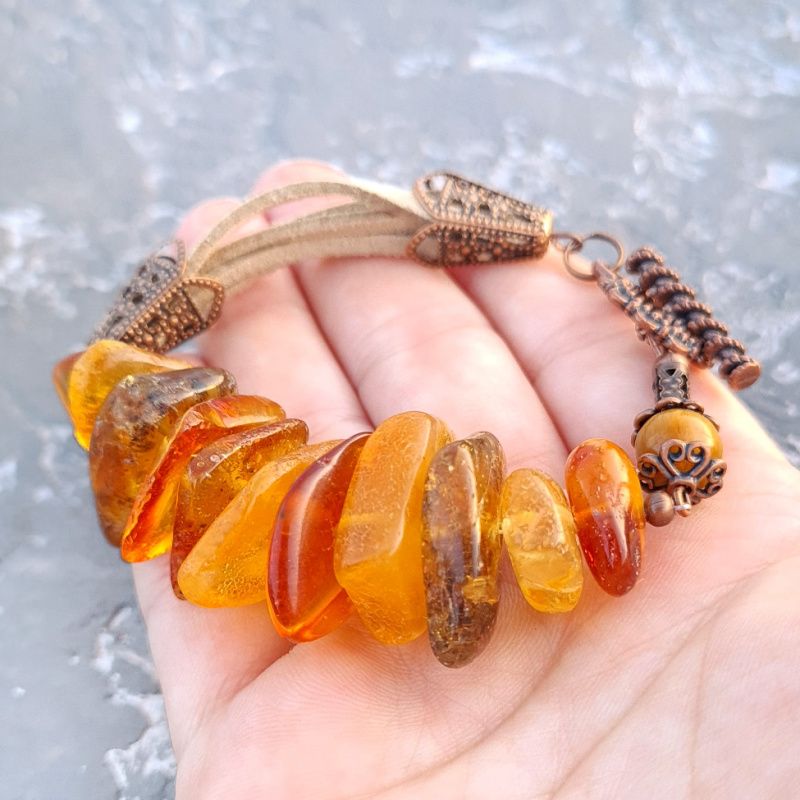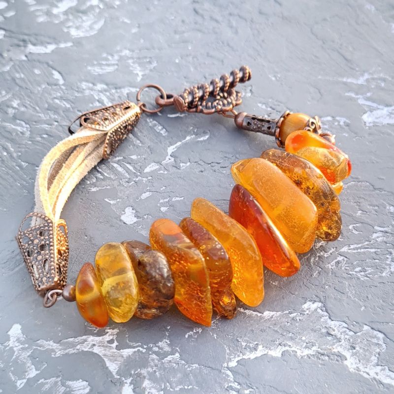 Стильный браслет из натурального необработанного янтаря (янтаря), очень хорошие прозрачные с различными оттенками бусины. Как бы леденцы "Монпасье" из нашего детства. Размер бусин: от 10 до 28 мм. Длина браслета- по вашему заказу! Стоимость указана за браслет, который на фото. В комплект также могу сделать колье или серьги по вашему пожеланиями.
