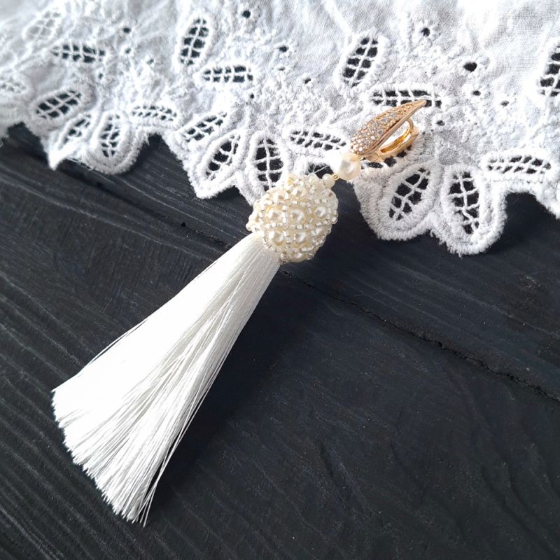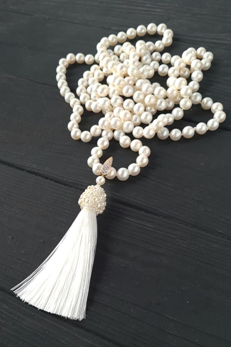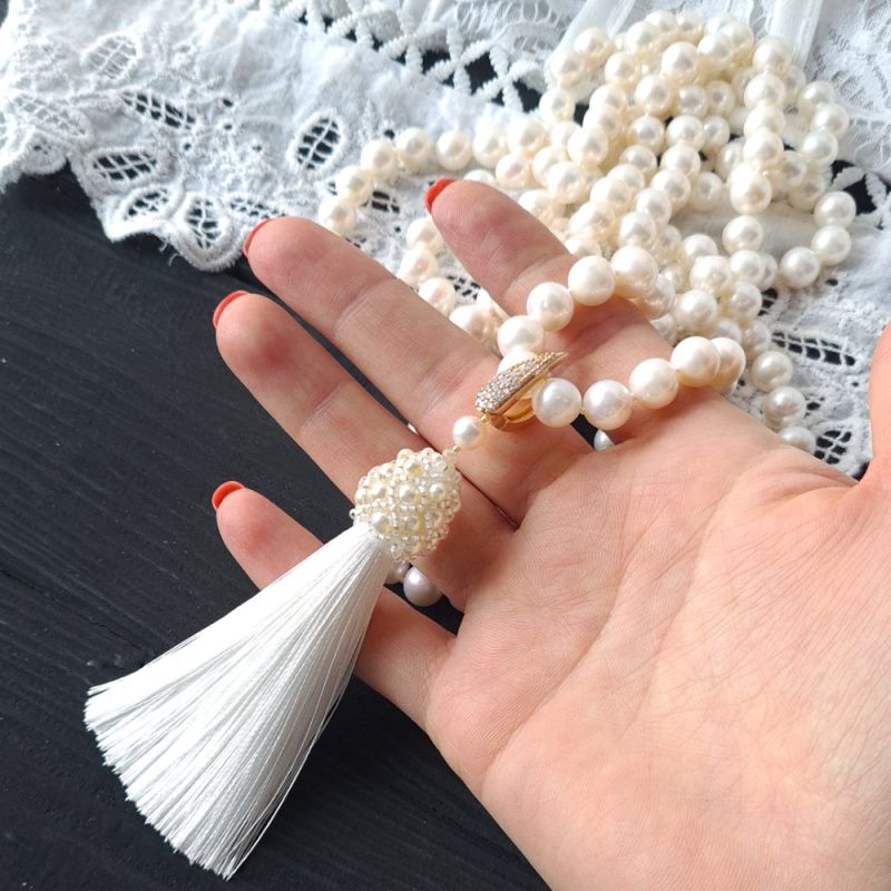 Колье- трансформер сотуар из натурального белого жемчуга высокого класса с подвеской - кисточкой, которую можно отстегнуть и носить отдельно. Кисть выполнена в технике ювелирного плетения, из жемчуга Swarovski в тон к ожерелью, японскому бисеру Delica и ювелирным кристаллам, застежка-держатель на киске: позолота по латуне, инкрустированная кристаллами циркона. Стоимость указана за колье как на фото, длиной 150 см. Размер жемчужин в бусах: 8-7.5 мм. По заказу – другой размер (меньше или больше). Ожерелье роскошное можно носить в одну длинную нить, два или даже 3 оборота, с кистью или без. Такая подвеска-кистица может быть пристегнута отдельно на ожерелье, или же на сумку, клатч, на пояс, или быть одета на ушко как моно серьга. К колье можно заказать браслет в аналогичном стиле.
