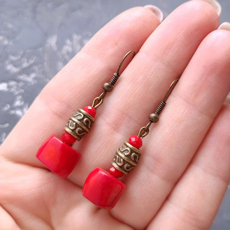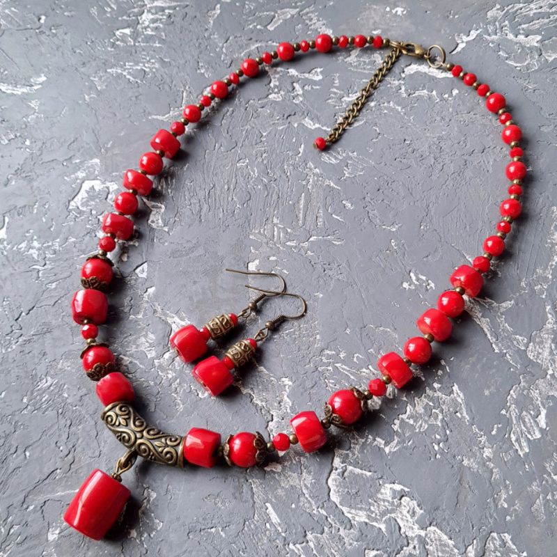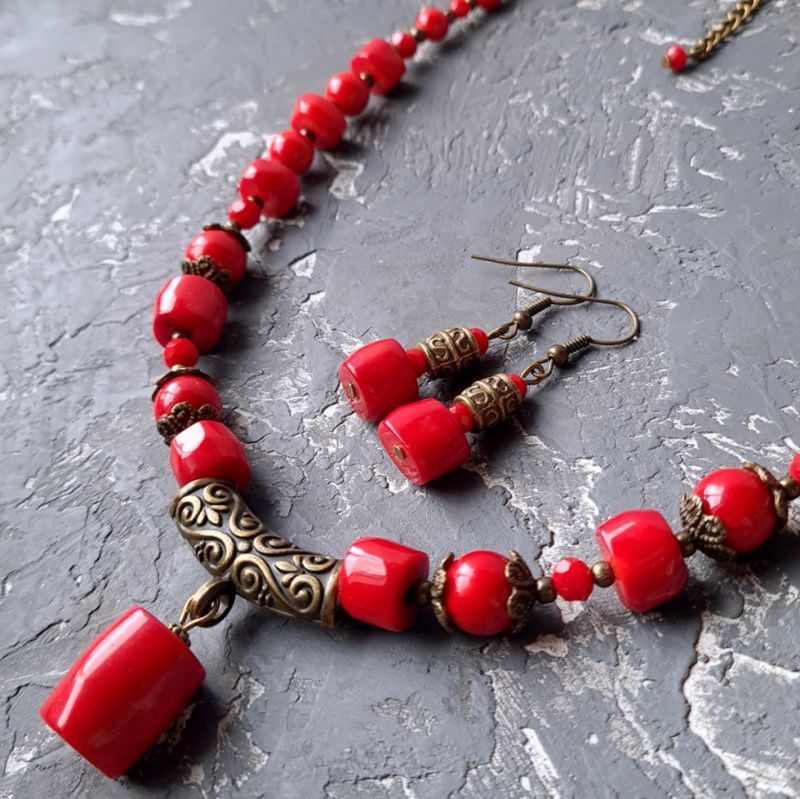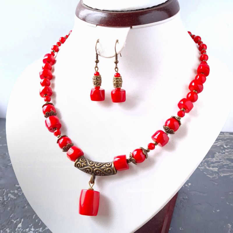 Колье и серьги с натуральнмы кораллами и этно орнаментом