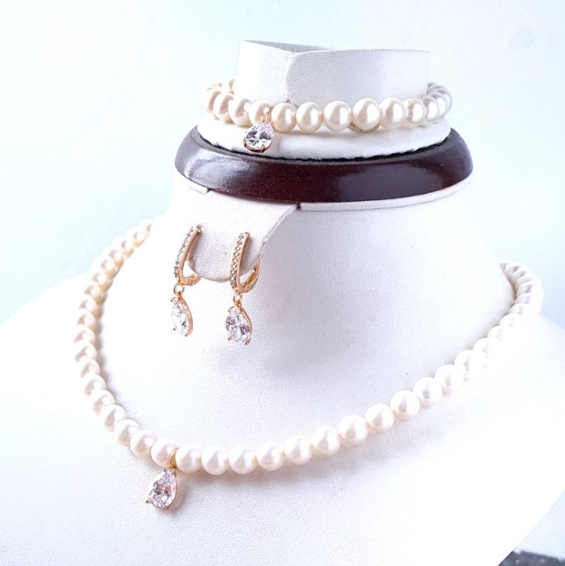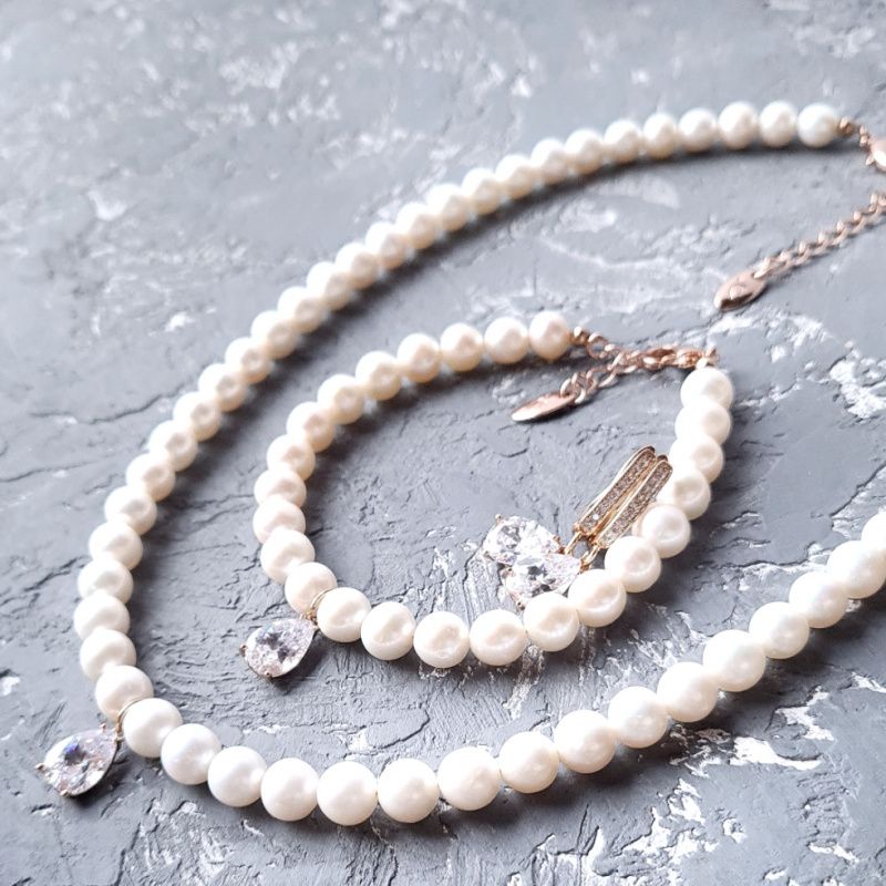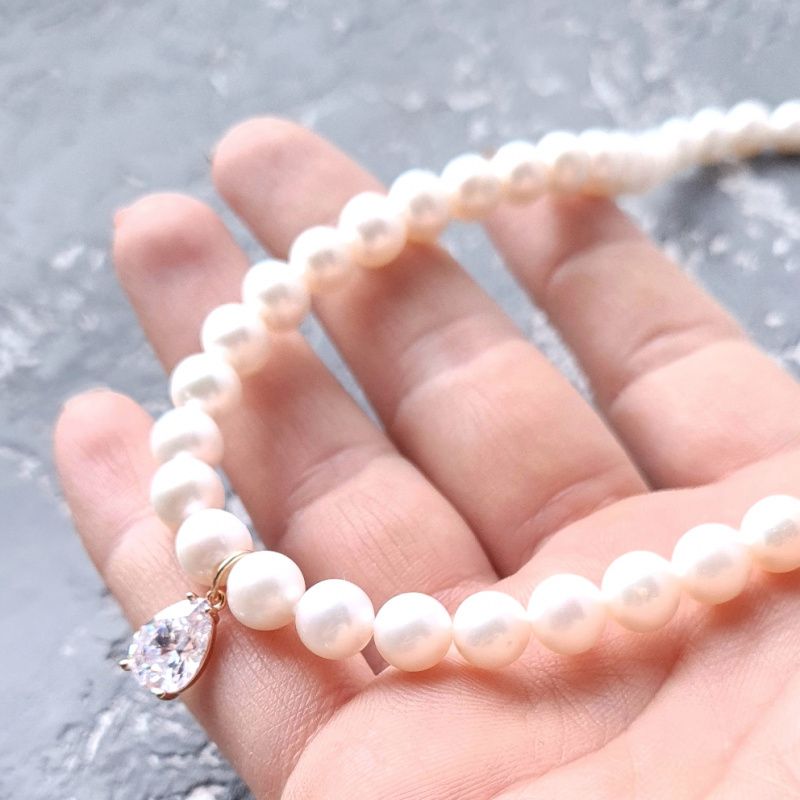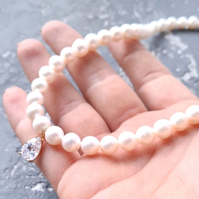 Колье из натуральных белого жемчуга высокого класса АА + с позолоченной подвеской в форме капли. Металл подвески и фурнитури- медицинский сплав, позолота по латуни, не вызывает аллергии или раздражения на теле. Диаметр жемчужин в колье 6-5.5 мм (по центру - крупнее, на концах - поменьше). Цвет жемчуга - натуральный белый. Стоимость указана за колье, как на фото, длиной 40 см + 5 см удлиняющий цепочку. По заказу я делаю любую длину, необходимую покупателю. Стоимость будет пересчитана в соответствии с нужной вам длины. Серьги и браслет на других фото не входят в стоимость, но могут быть заказаны отдельно. На последнем фото есть праздничный футляр из натурального дерева, который не входит в стоимость, но может быть заказан отдельно.