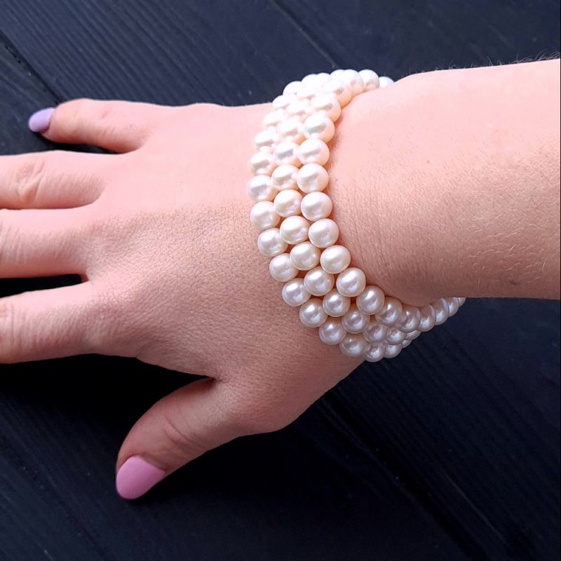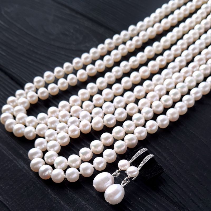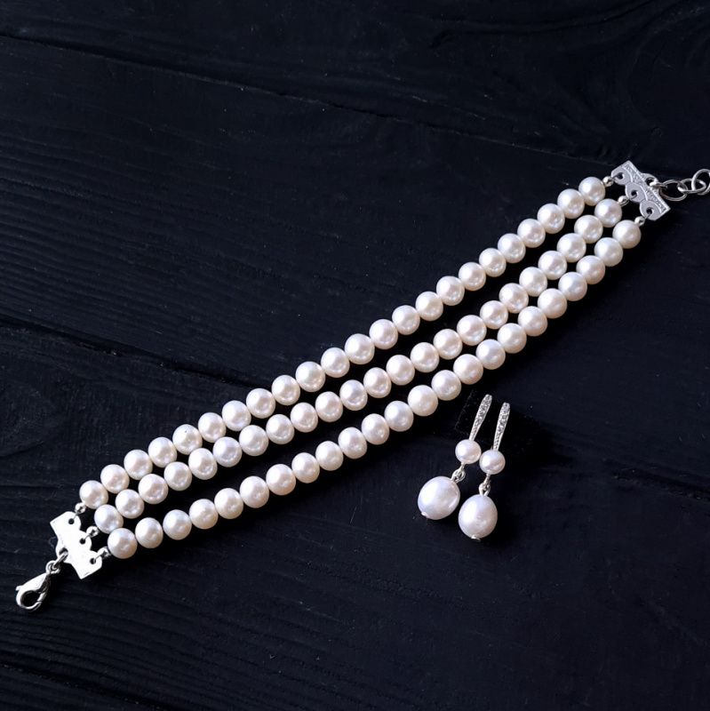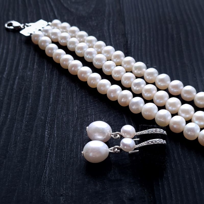 Роскошный комплект украшений: трехрядный браслет и серьги из натурального жемчуга в фурнитуре из серебра 925 пробы отечественного завода производителя. Размер жемчужин в браслете: 7 мм. Стоимость указана за комплект как на фото, где браслет длиной до 18 см включительно и серьги. По заказу длину браслета делаю нужную вам (согласуем после оформления заказа). На других фото есть ожерелье, не входящее в стоимость и данное для примера. Вы также можете заказать браслет в комплект ожерелья или колье - аналогичного или иного дизайна, который есть в моем магазине.
