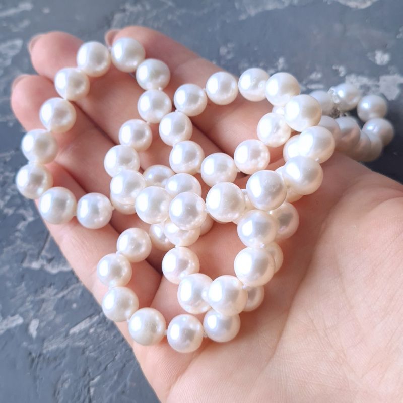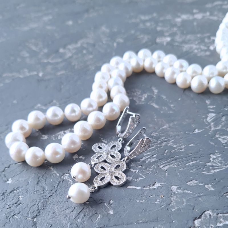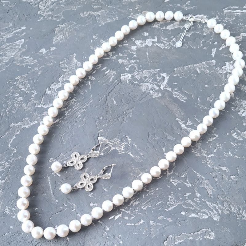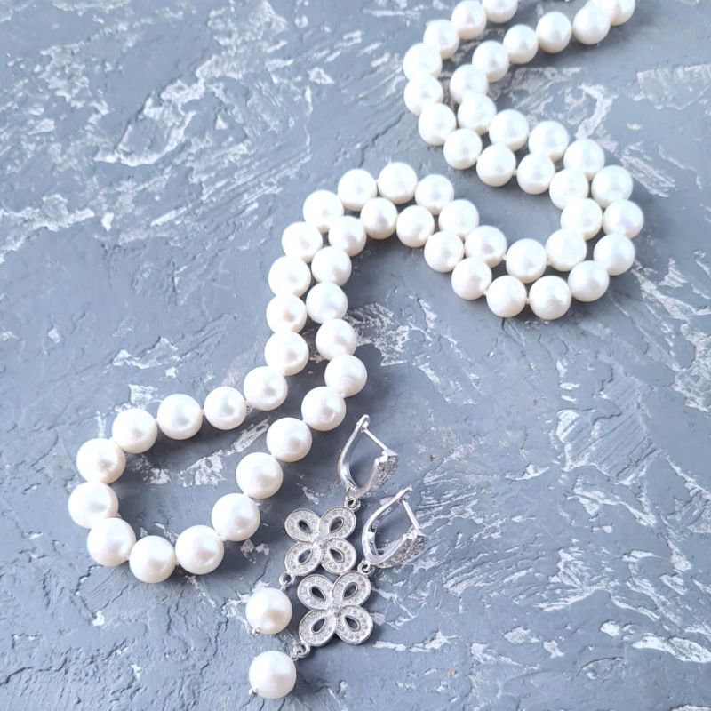 Комплект украшений: ожерелье из крупных белых натурального жемчуга, размером 9-8 мм (по центру - крупные, по краям - меньше) и серьги - с кристаллами циркона, сияющих как бриллианты. Для того, чтобы в раковине выросла жемчужина такого размера, требуется гораздо больше времени, чем для жемчужин размером меньше, например, 6 мм. Поэтому, комплект с жемчугом, размером 6 мм, будет стоить гораздо дешевле, чем 9 мм. Жемчуг нанизаны через узелок - это мировой стандарт для жемчуга в ожерелье. Но по желанию можно сделать и сплошной нитью, без узелков. Жемчужины в колье хорошего качества, округлой формы, светятся естественным блеском. Класс жемчуга АА-АА + Колье на шее выглядит роскошно, а небольшие пятнышки на Жемчужинка только подтверждают их натуральность. Стоимость указана за бусы как на фото, длиной до 45 см включительно и серьги, как на фото. Длина сережек 50 мм. Застежки серег: медицинский сплав, английский замок. Если вам нужна любая другая длина ожерелья - пишите при оформлении или после оформления заказа - в личные сообщения. Стоимость будет пересчитана согласно нужной вам длины. По заказу можно установить застежку в ожерелье с удлинителем, и застежки в серьги из серебра 925 пробы. Также в комплект можно заказать браслет из жемчуга. Есть продажа украшений отдельно.