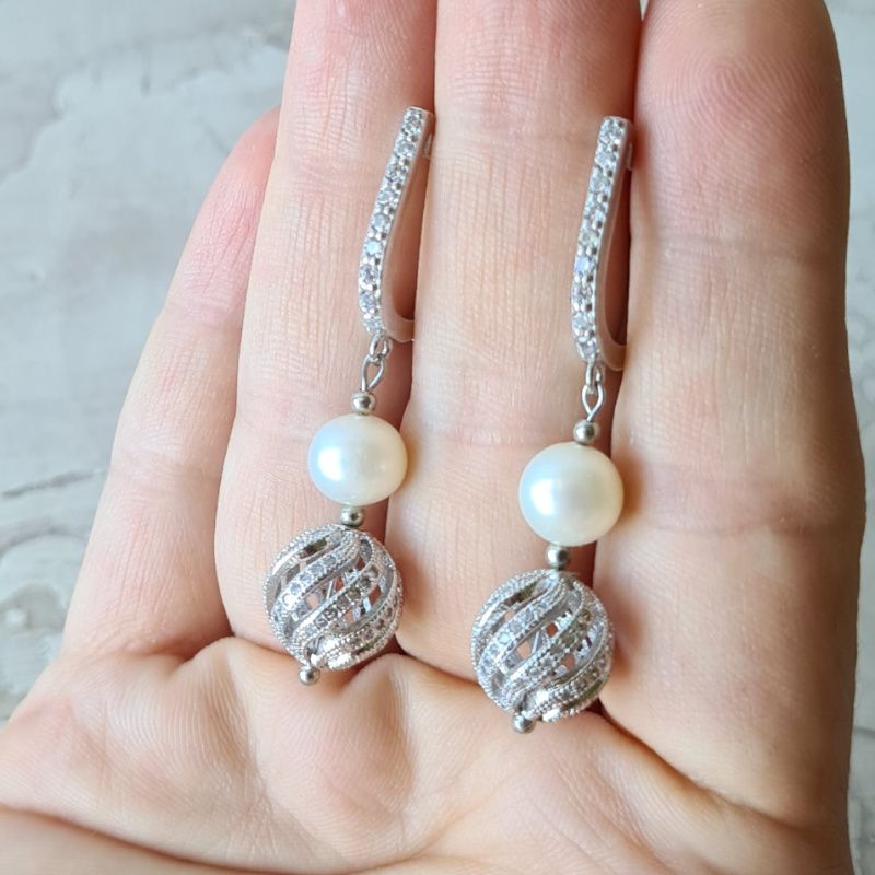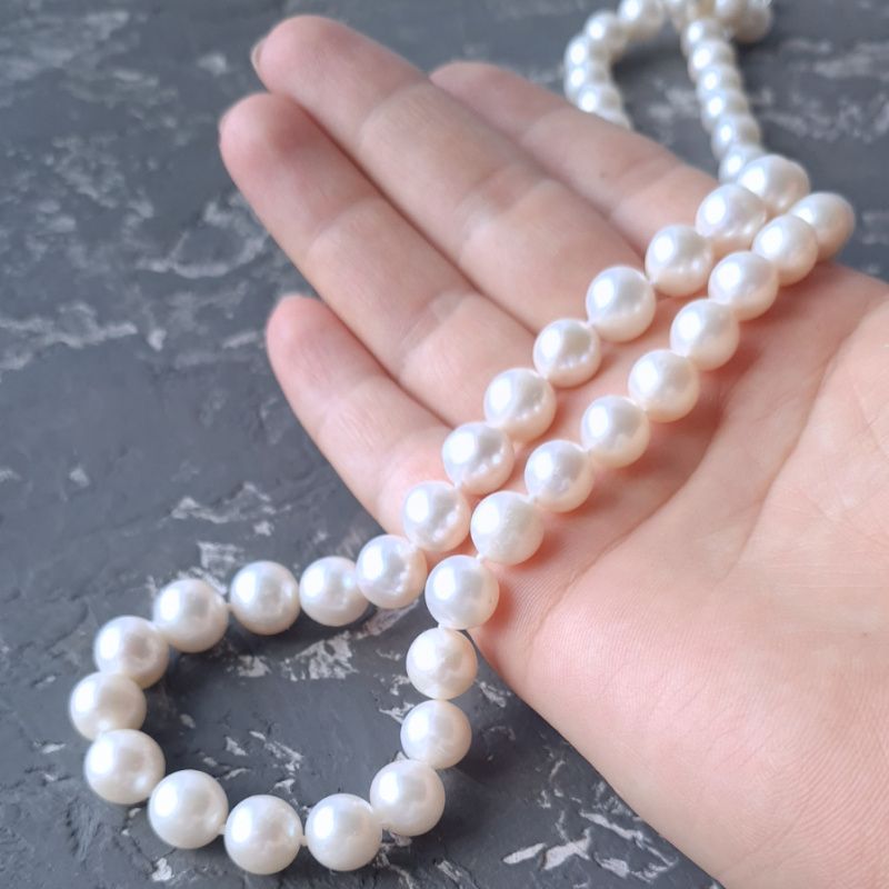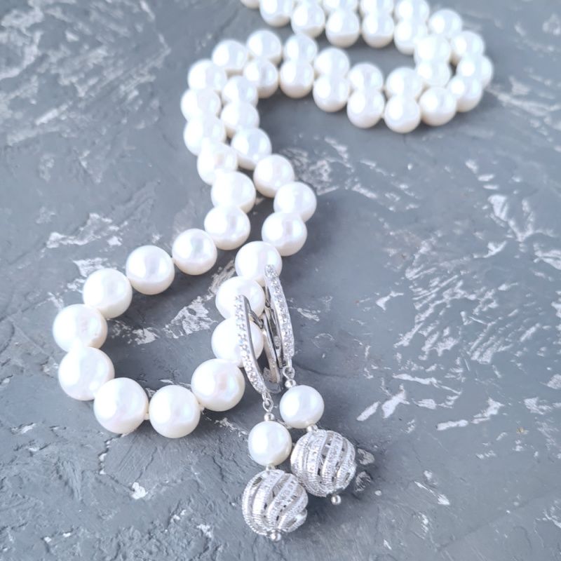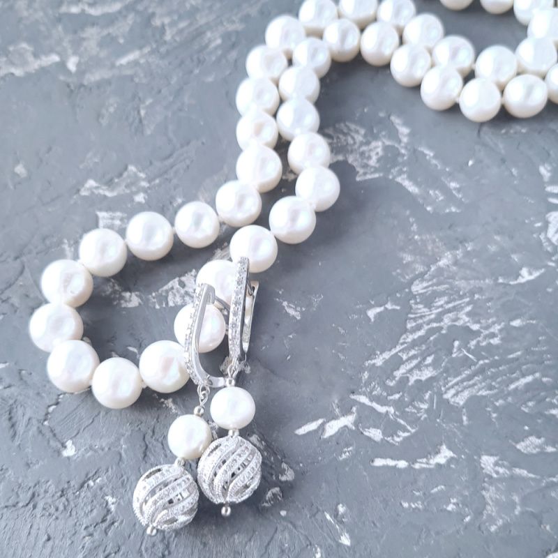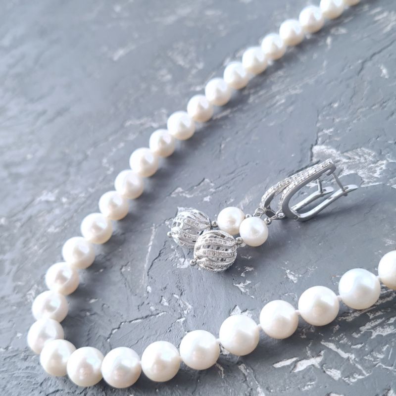 Комплект украшений: ожерелье из крупных белых натурального жемчуга, размером 9-8 мм (по центру - крупные, по краям - меньше) и серьги - с кристаллами циркона, сияющих как бриллианты. Для того, чтобы в раковине выросла жемчужина такого размера, требуется гораздо больше времени, чем для жемчужин размером меньше, например, 6 мм. Поэтому, комплект с жемчугом, размером 6 мм, будет стоить гораздо дешевле, чем 9 мм. Жемчуг нанизаны через узелок - это мировой стандарт для жемчуга в ожерелье. Но по желанию можно сделать и сплошной нитью, без узелков. Жемчужины в колье хорошего качества, округлой формы, светятся естественным блеском. Класс жемчуга АА-АА + Колье на шее выглядит роскошно, а небольшие пятнышки на Жемчужинка только подтверждают их натуральность. Стоимость указана за бусы как на фото, длиной до 45 см включительно и серьги, как на фото. Длина сережек 50 мм. Застежки серег: медицинский сплав, английский замок. Если вам нужна любая другая длина ожерелья - пишите при оформлении или после оформления заказа - в личные сообщения. Стоимость будет пересчитана согласно нужной вам длины. По заказу можно установить застежку в ожерелье с удлинителем, и застежки в серьги из серебра 925 пробы. Также в комплект можно заказать браслет из жемчуга. Есть продажа украшений отдельно.