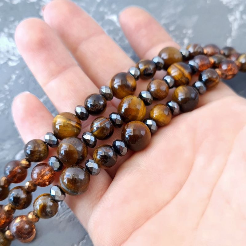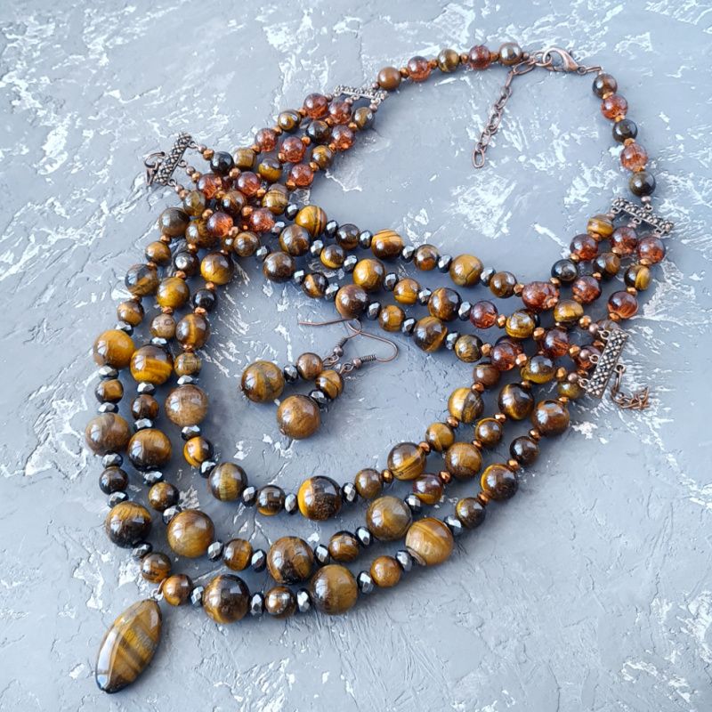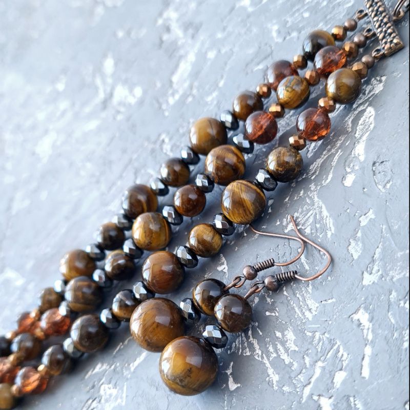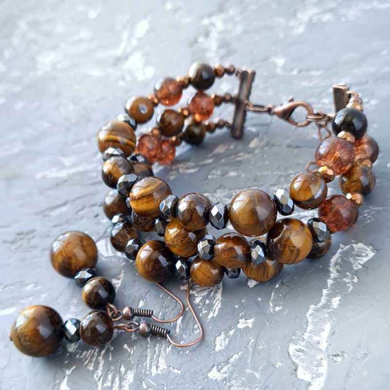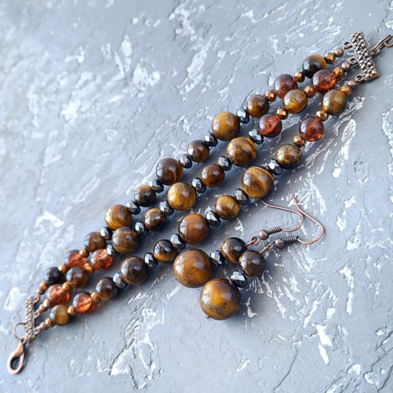Стильный комплект из натуральных камней тигриных глаз и гематит: браслет и серьги. Классическое сочетание коричневого, графитового черного и золотого - роскошные украшения для стильной женщины, любит классику и четкость форм. Стоимость указана за комплект: браслет, длиной 18 см и серьги. В браслете установлено удлиняющий цепочку плюс 3 см. Поэтому вы сами можете регулировать его длину. Я могу сделать для вас любую другую длину браслета, нужную вам! Стоимость будет пересчитана согласно нужной вам длины. Длина сережек 40 мм. Можно серьги с серебряными застежками. На других фото есть ожерелье, не входит в стоимость, но может быть заказано отдельно. В комплект могу сделать ожерелье или кулон на цепочке по вашим пожеланиям.