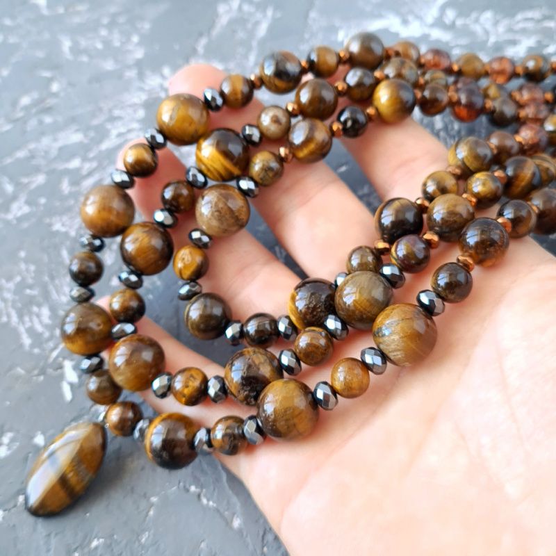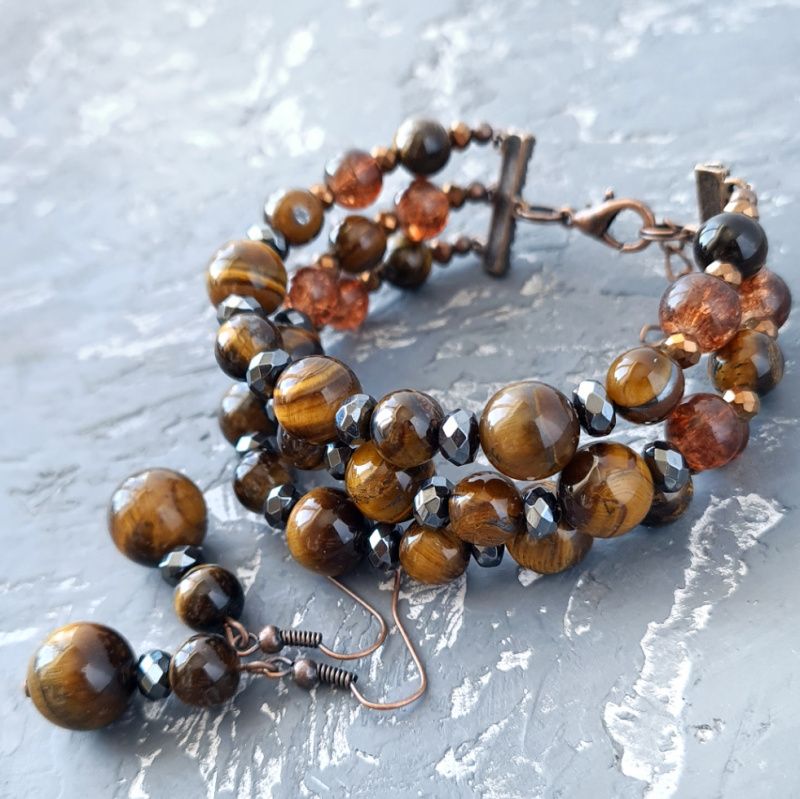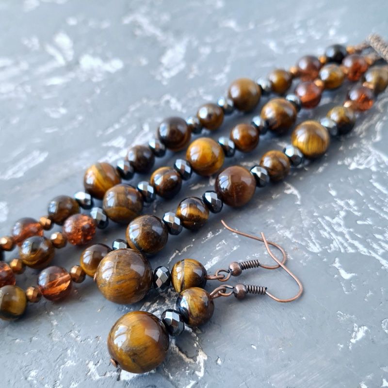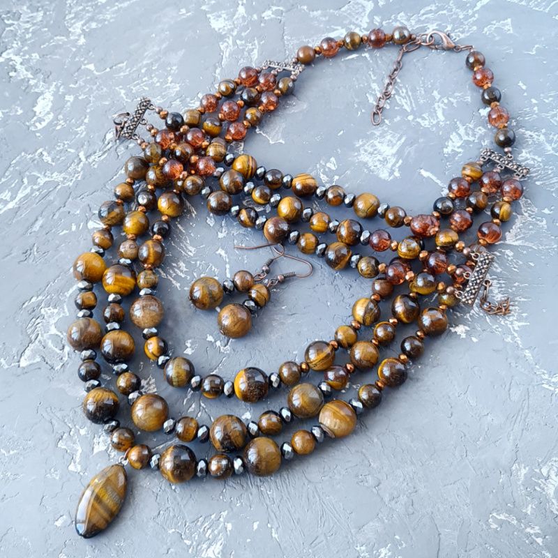 Стильный комплект: трехрядной колье, браслет и серьги из натуральных камней тигриных глаз и гематит. Классическое сочетание коричневого, графитового черного и золотого - роскошные украшения для стильной женщины, любит классику и четкость форм. Стоимость указана за комплект: ожерелье как на фото, длина верхней нити: 45 см, средней 47 см, нижней: 50 см; браслет и серьги. В ожерелье установлено удлиняющий цепочку плюс 5 см. Поэтому вы сами можете регулировать его длину. Я могу сделать для вас любую другую длину ожерелья и браслета, нужную вам! Стоимость будет пересчитана согласно нужной вам длины. Длина сережек 40 мм. В комплект могу сделать браслет по вашим пожеланиям.
