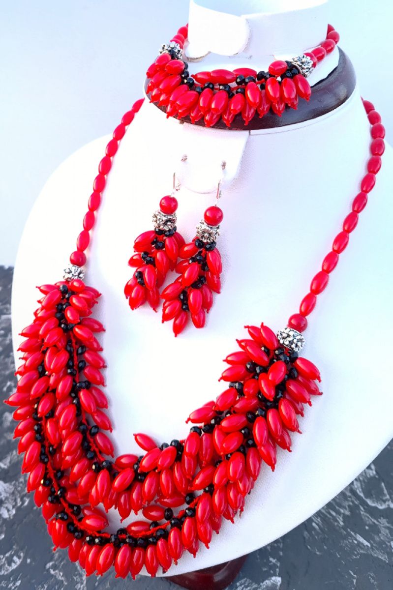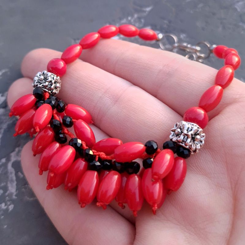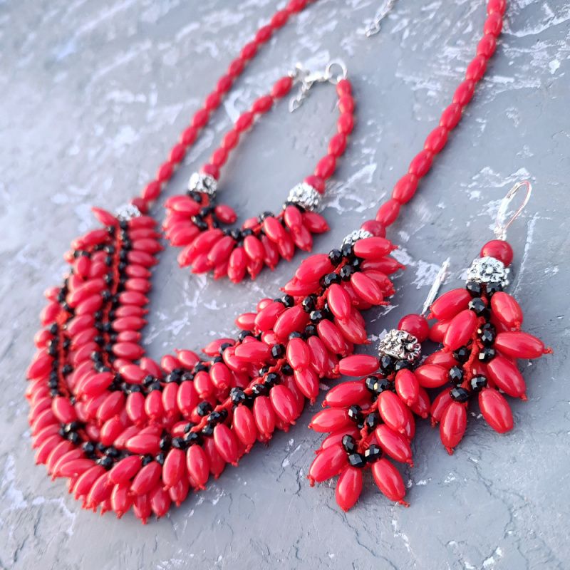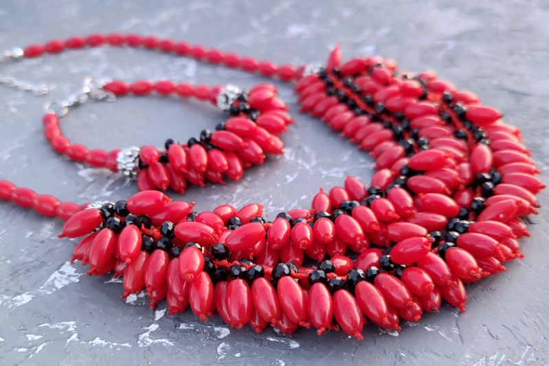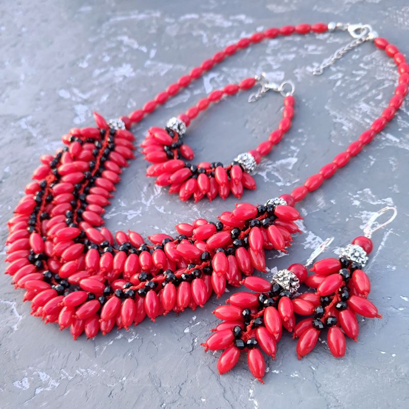 Комплект украшений из натуральных кораллов для стильных и харизматичных. Только натуральные кораллы высокого качества, и черные граненые бусинки, сияющих, как в танце, при каждом движении. Пышное ожерелье двухрядное, браслет и серьги с застежками в серебре 925 пробы. Такой комплект из кораллов -прекрасный подарок для вашей подруги, женщины, невесты, сестры, мамы на день рождения, на коралловая свадьба, или просто, чтобы порадовать любимого человека. Стоимость указана за комплект, где длина ожерелья 44 см + 5 см удлиняющий цепочку и браслет (длина согласовывается при заказе) и серьги. На заказ- любая другая, нужна вам длина ожерелья. Стоимость будет пересчитана в соответствии с нужной вам длины. Есть продажа украшений отдельно.