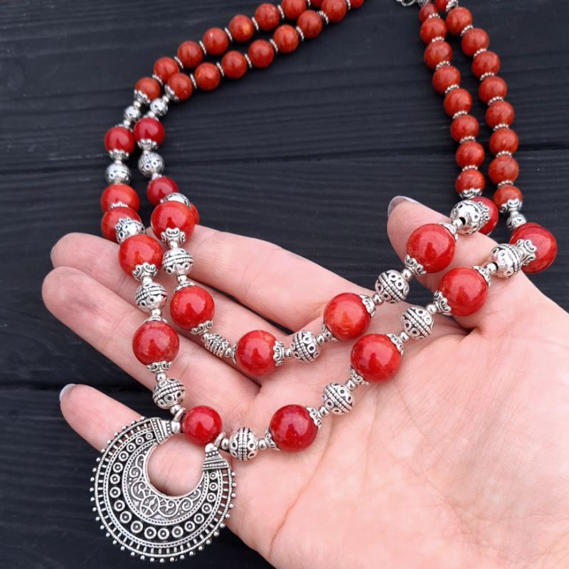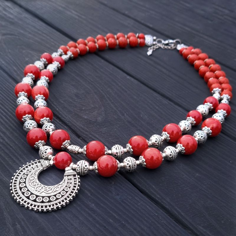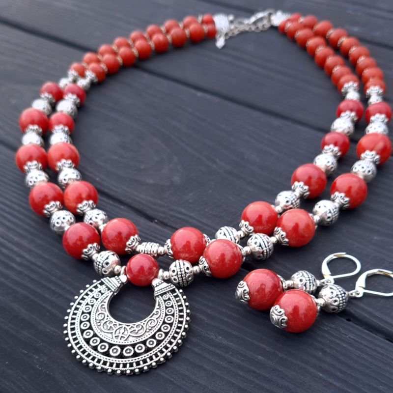 Комплект украшений: колье из натуральных кораллов спокойного не яркие цвета красного кирпича с лунницах по центру и серьги с серебряными застежками. Красивое ожерелье и серьги под вышиванку, белую или черную блузку, платье или даже обычную рубашку - прекрасный подарок женщине, жене, подруге, маме, сестре на день рождения или коралловая свадьба. Стоимость указана за комплект: колье, где длина верхней ряда 44 см, плюс 3 см следующая ряд и серьги. На конце бусы есть удлиняющий цепочку +5 см, чтобы вы самостоятельно могли регулировать длину. По заказу могу сделать любую другую, нужную вам длину. Стоимость будет перечислено по нужной вам длины.