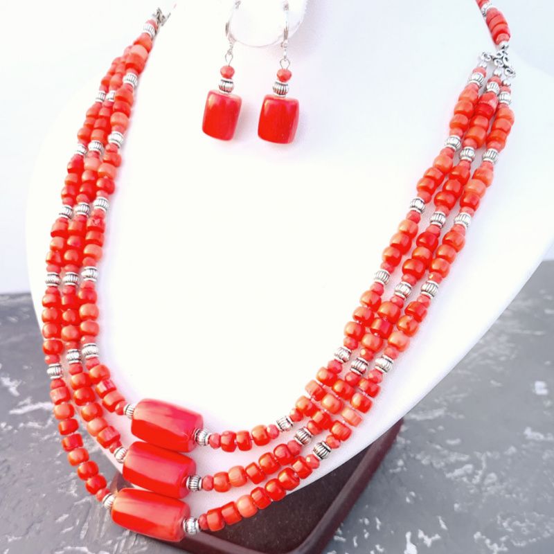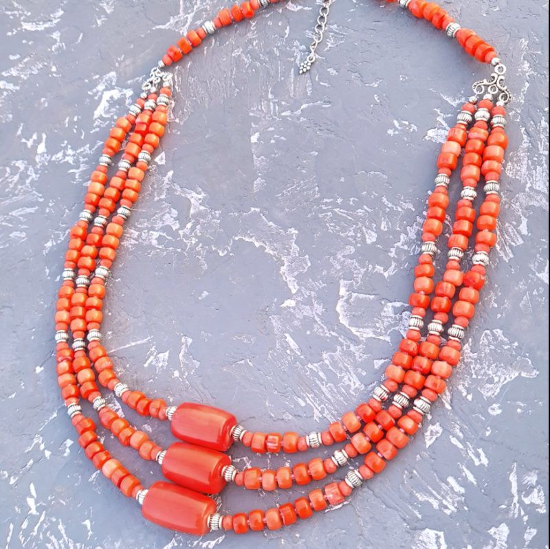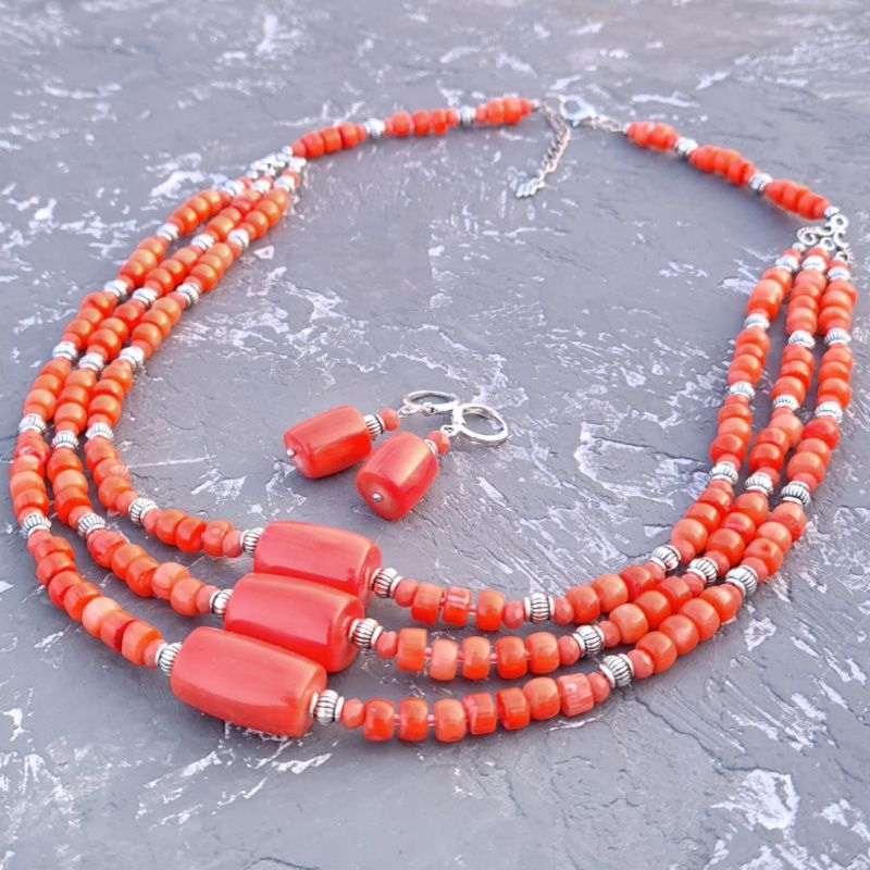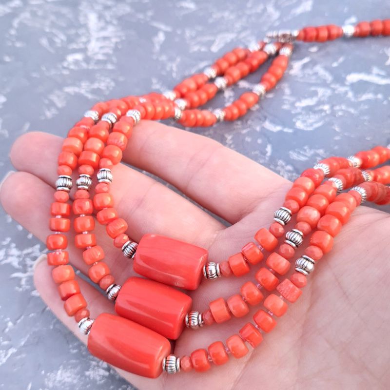 Комплект украшений: ожерелье трехрядной из натуральных кораллов и сережек "Наследие-2" Застежки сережек: серебро 925 пробы. В ожерелье по центру использованы натуральные кораллы формы "бочонок" длиной 18-20 мм, а также другие бусинки все, кроме граненых хрустальных есть из натурального коралла. На камне есть дырочки и крапинки, что как раз и подтверждают натуральность, а также придают особое аутентичного шарма украшениям, сделанные под старину. Стоимость указана за комплект, как на фото, ожерелье длиной 45 см по обхвату шеи + 1-2 см каждая следующая ряд плюс ланцюжок- удлинитель 5 см, что позволяет регулировать длину. По заказу я делаю любую длину ожерелья, нужную вам. Стоимость будет пересчитана в соответствии с нужной вам длины. Можно также заказать браслет в комплект. На последнем фото есть праздничный футляр из натурального дерева, который не входит в стоимость, но может быть заказан отдельно.
