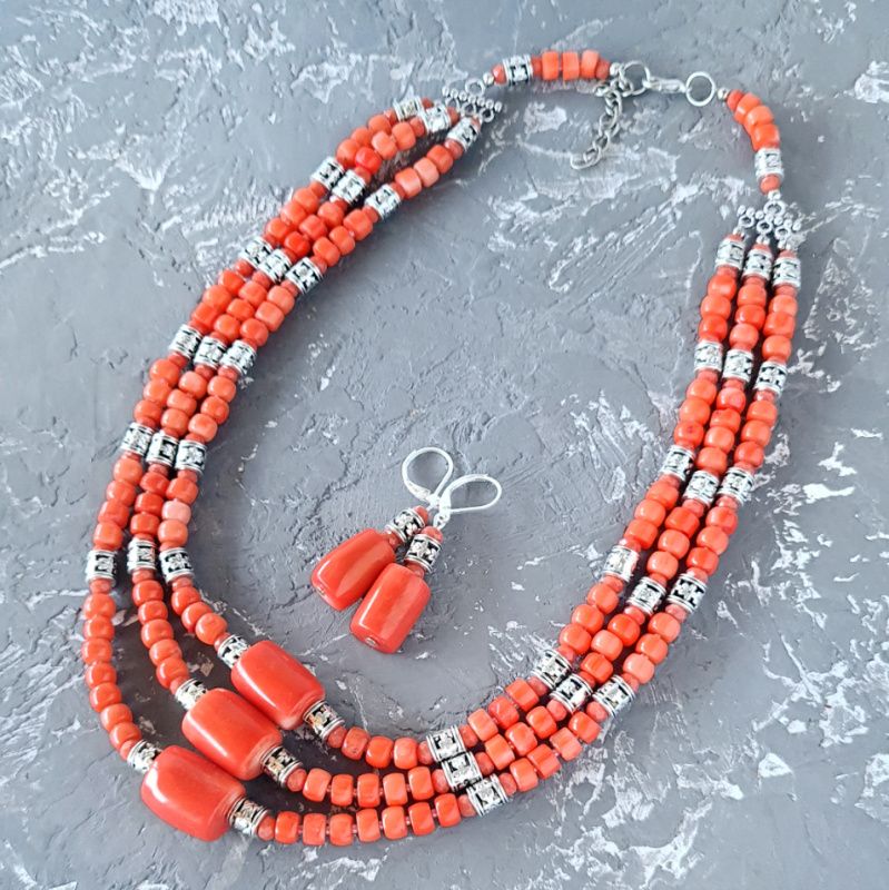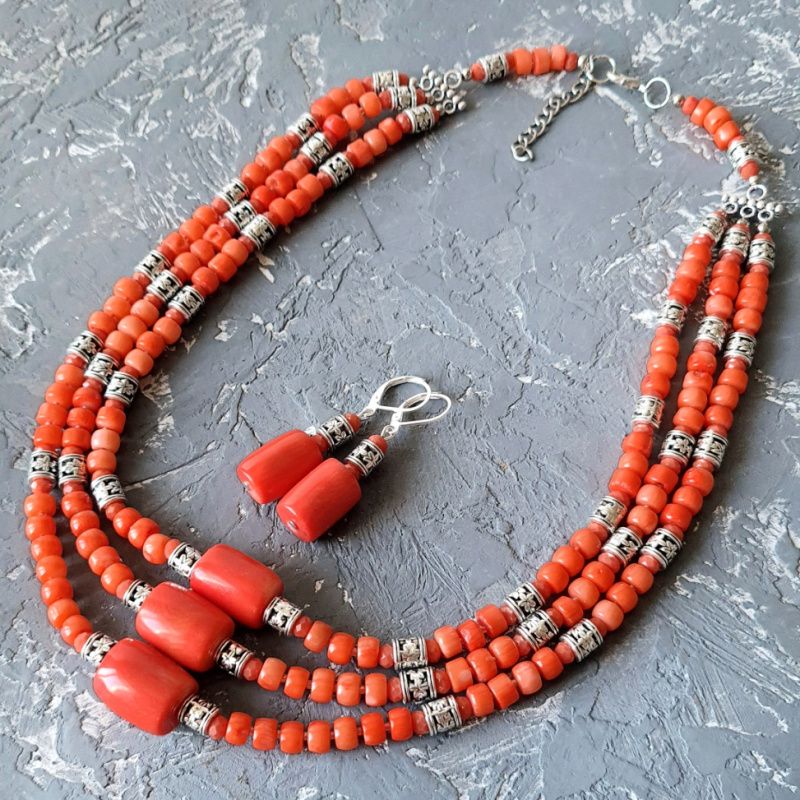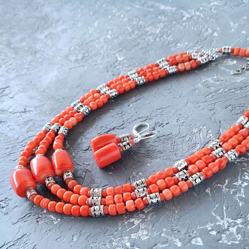 Комплект украшений: ожерелье трехрядной из натуральных кораллов и сережек "Наследие-3" Застежки сережек: серебро 925 пробы. В ожерелье по центру использованы натуральные кораллы формы "бочонок" длиной 18-20 мм, а также другие бусинки все, кроме граненых хрустальных есть из натурального коралла. На камне есть дырочки и крапинки, что как раз и подтверждают натуральность, а также придают особое аутентичного шарма украшениям, сделанные под старину. Стоимость указана за комплект, как на фото, ожерелье длиной 45 см по обхвату шеи + 1-2 см каждая следующая ряд плюс ланцюжок- удлинитель 5 см, что позволяет регулировать длину. По заказу я делаю любую длину ожерелья, нужную вам. Стоимость будет пересчитана в соответствии с нужной вам длины. Можно также заказать браслет в комплект. Украшения можно приобрести отдельно.