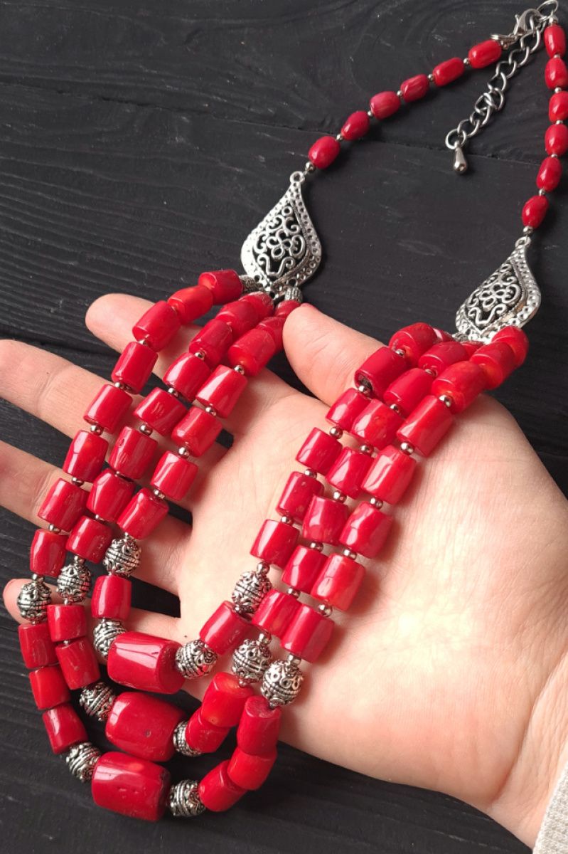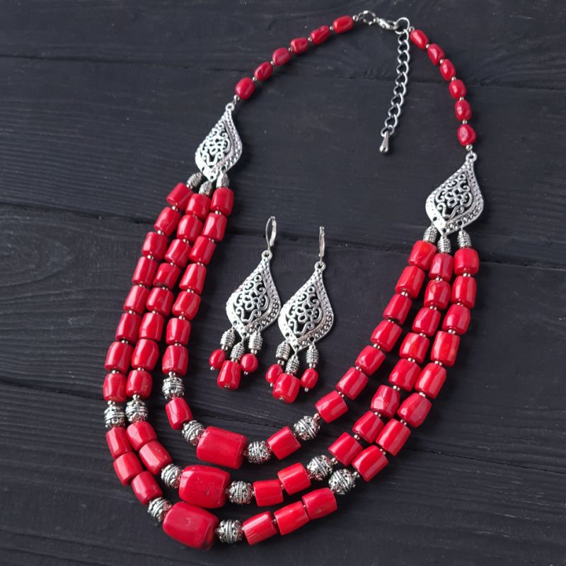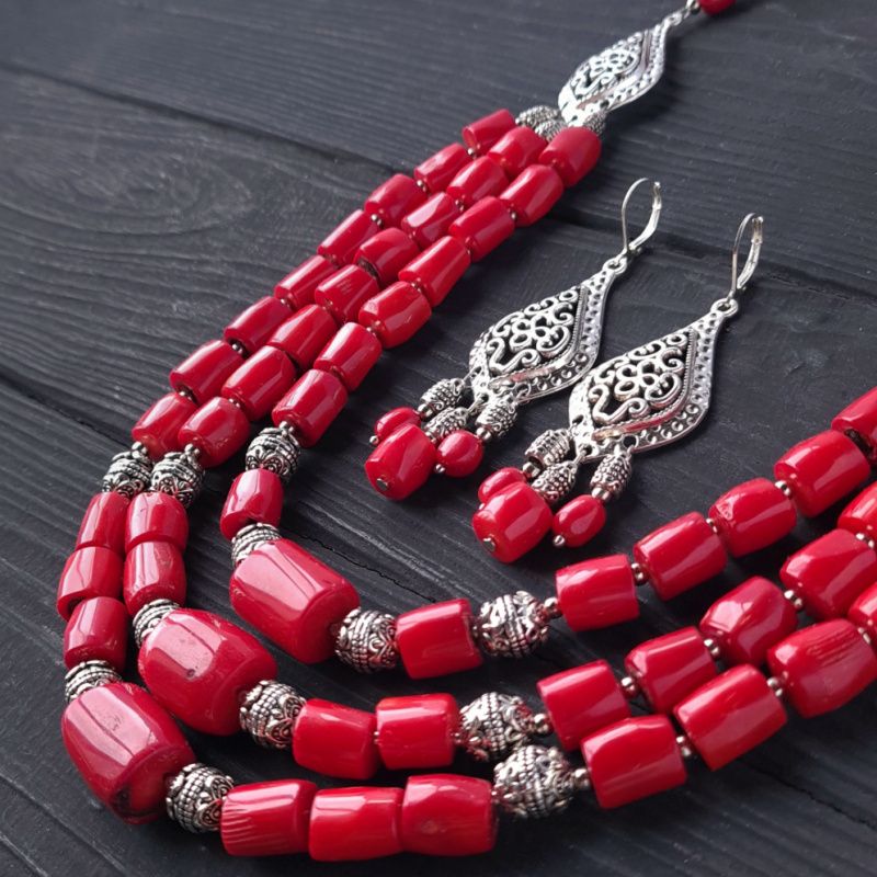 Комплект украшений из натуральных кораллов: ожерелье трехрядной и серьги Застежки сережек: серебро 925. На кораллах есть черные пятнышки, черточки и дырочки, что и является признаком натуральности, что придает особый шарм украшениям и ощущение "живого" камня. Если вам нужно "идеальное" намисто- заказывайте его с имитации коралла или стеклянных бусин. Стоимость указана за комплект, как на фото: ожерелье длиной 49 см по обхвату шеи + 1-2 см каждая следующая ряд и серьги. Длина ожерелья также регулируется с помощью удлинительного цепочки. По заказу я делаю любую длину ожерелья, нужную вам. Стоимость будет пересчитана в соответствии с нужной вам длины. Украшения можно заказать отдельно.