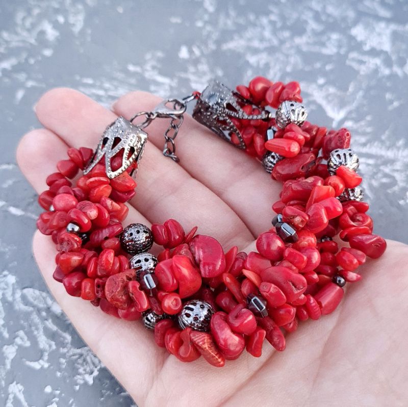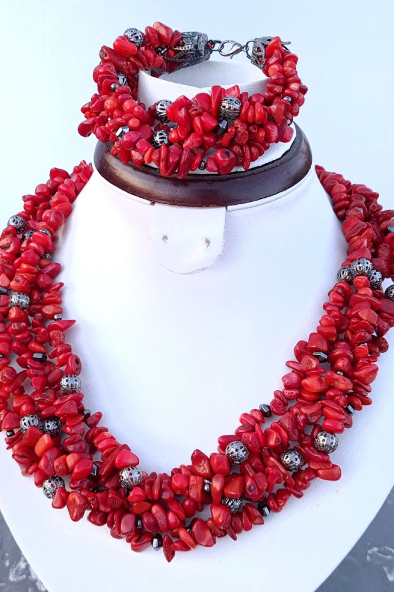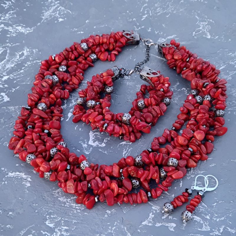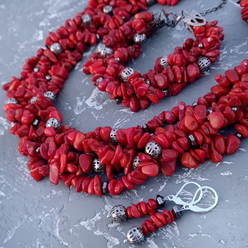 Комплект украшений из натуральных кораллов: Семирядне ожерелье, пятирядний браслет и серьги с серебряными застежками. Пышное красное ожерелье и браслет из кораллов -прекрасный подарок для вашей подруги, женщины, невесты, сестры, мамы на день рождения, на коралловая свадьба, или просто, чтобы порадовать любимого человека. Стоимость указана за комплект, где длина ожерелья 45 см + 5 см удлиняющий цепочку и браслет (длина согласовывается при заказе). На заказ- любая другая, нужна вам длина ожерелья. Стоимость будет пересчитана в соответствии с нужной вам длины. Есть продажа украшений отдельно. На последнем фото есть праздничный футляр из натурального дерева, который не входит в стоимость, но может быть заказан отдельно.