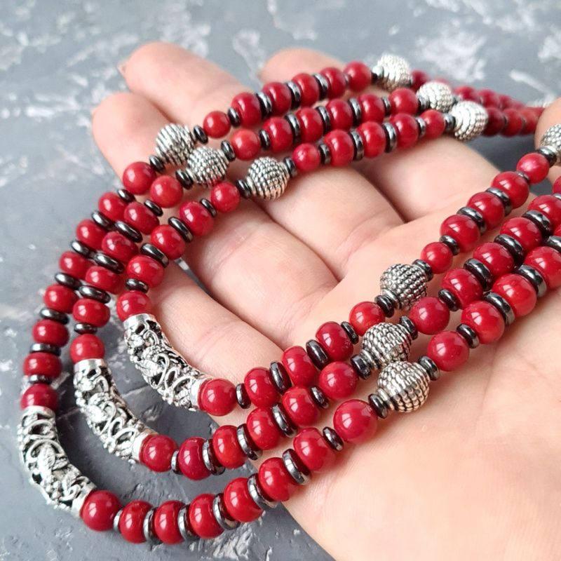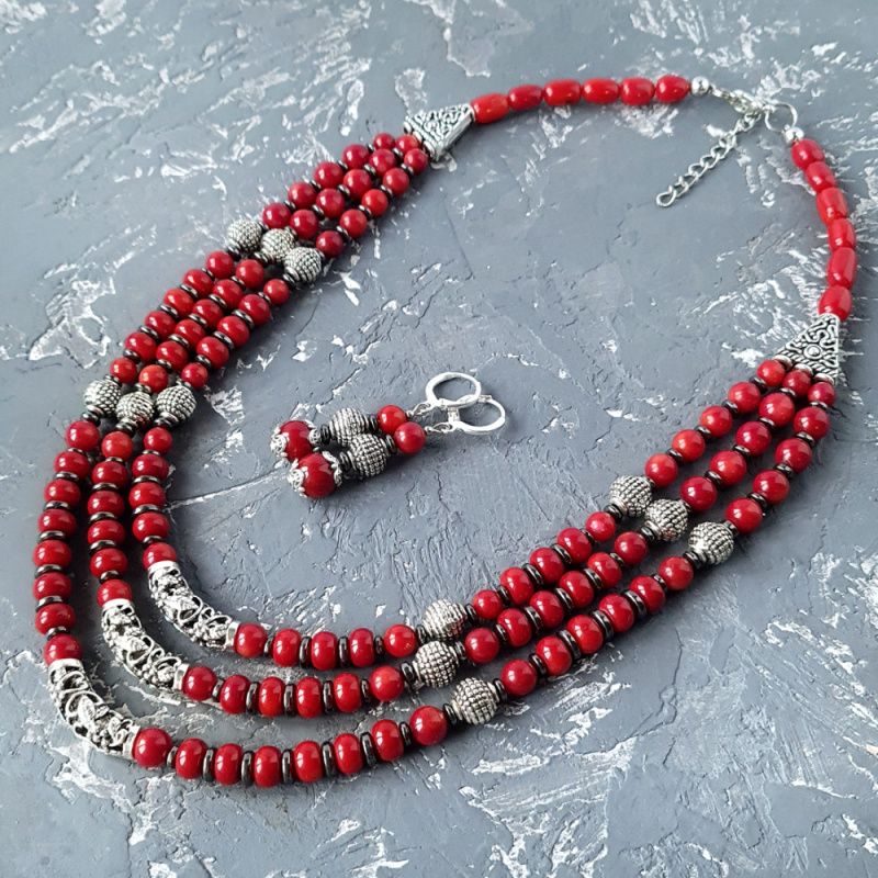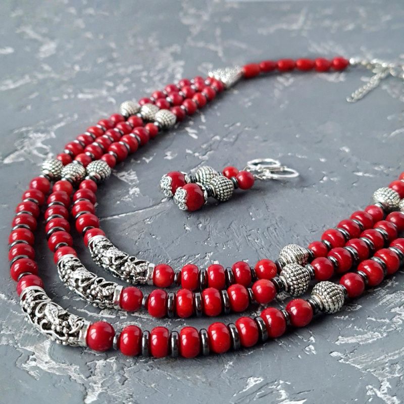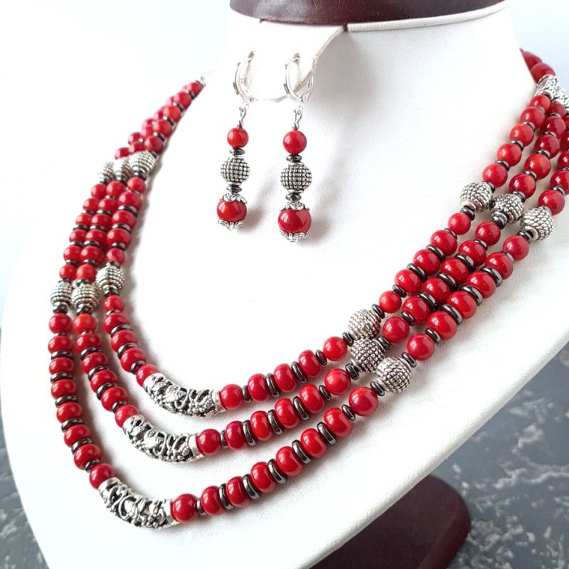 Комплект украшений: Ожерелье и серьги с натуральными кораллами и гематитом. Застежки серег: серебро 925 пробы. Красивое ожерелье и серьги под вышиванку, белую или черную блузку, платье или даже обычную рубашку - прекрасный подарок вашей женщине, жене, подруге, маме, сестре на день рождения или коралловая свадьба. Стоимость указана за комплект: бусы, длиной верхней ряда: 45 см, плюс 3 см каждая следующая ряд, и серьги. На конце бусы есть удлиняющий цепочку +5 см, чтобы вы самостоятельно могли регулировать длину ожерелья. По заказу могу сделать любую другую, нужную вам длину. Стоимость будет перечислено по нужной вам длины. К бусы в комплект могу сделать браслет. Можно приобрести украшения отдельно. На последнем фото есть праздничный футляр из натурального дерева, который не входит в стоимость, но может быть заказан отдельно.