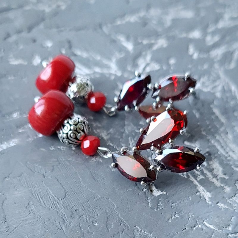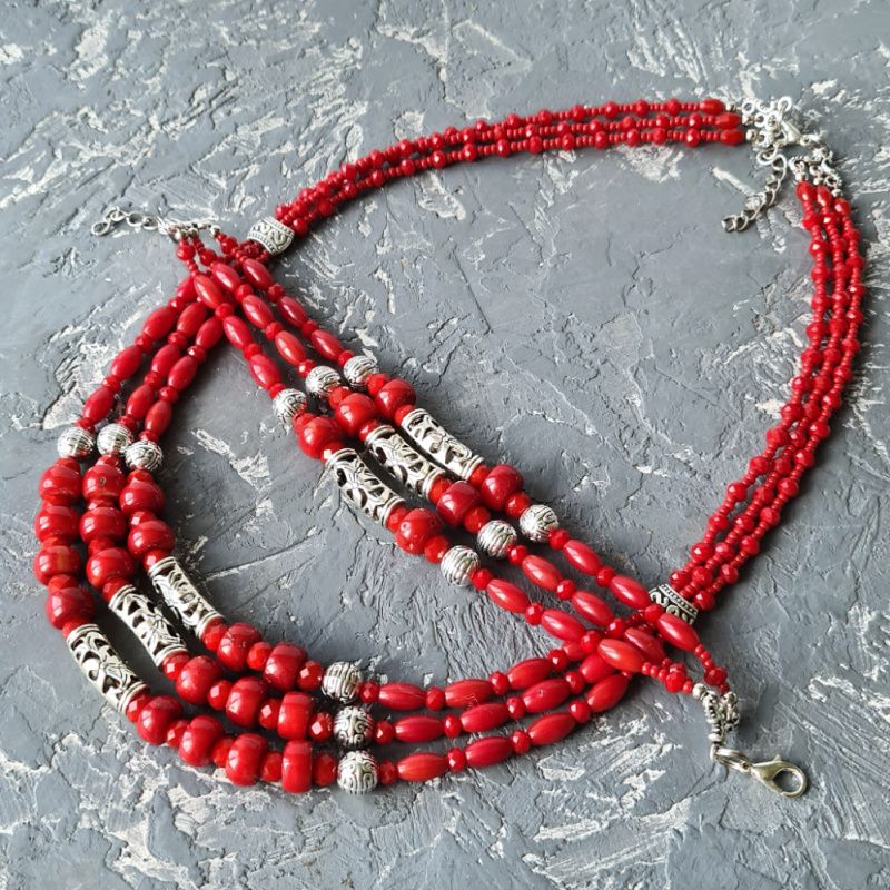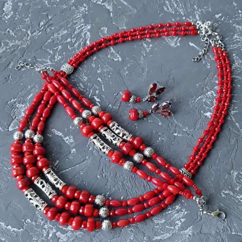 Комплект украшений из натуральных кораллов: Ожерелье трехрядный, браслет и серьги с яркими красными кристаллами циркона. Застежки серег: качественная родированным медицинская сталь, не вызывает аллергии или раздражения. Тип застежки: гвоздик. На заказ можно сделать с английскими застежками. Стоимость указана за комплект, как на фото: ожерелье длиной 45 см по обхвату шеи + 1-2 см каждая следующая ряд и браслет как на фото (длина регулируется) + серьги. По заказу я делаю любую длину ожерелья и браслета, нужную вам. Стоимость будет пересчитана в соответствии с нужной вам длины. Все украшения можно заказать отдельно.