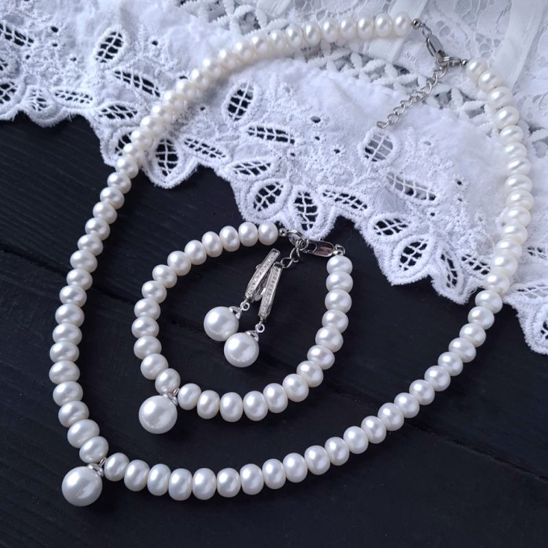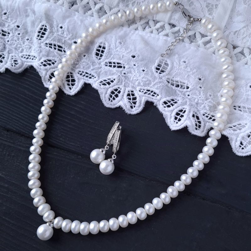 Колье и серьги из натурального жемчуга высокого класса и подвески с жемчужиной Майорка. Размер жемчужин в колье: 8-7 мм ( по центру более крупные, по краям - меньшие). Размер жемчужин в подвесках: 10 мм. Стоимость указана за комплект, где длина бусы 45 см плюс 5 см удлинительная цепочка и серьги. На заказ – любая другая, нужная вам длина ожерелья. Стоимость будет перечислена в соответствии с требуемой вам длиной. На заказ может быть больший или меньший размер жемчуга. Под заказ можно в фурнитуре из серебра 925 пробы. Стоимость соответственно тоже будет другой. Жемчужина Майорки в подвеске - это качественный дорогостоящий заменитель натурального жемчуга, изготавливаемый по технологии, приближенной к образованию настоящего жемчуга, с использованием пыльцы перетертого жемчуга, что позволяет максимально точно воспроизвести цвет и натуральное сияние жемчужин. Поэтому жемчуг Майорки имеет очень близкий к натуральному блеску, цвет и вес. Застежка, серьги и бейл в подвеске медицинского сплава. На других фото есть браслет, не входящий в стоимость, но может быть заказан отдельно.