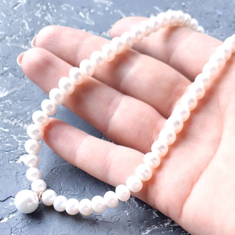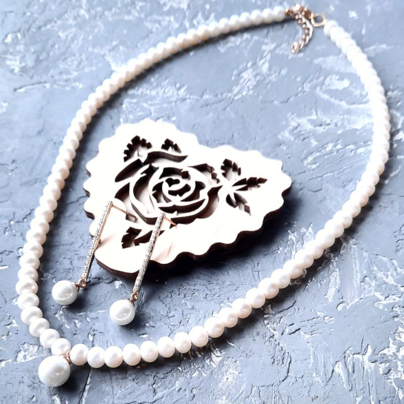 Колье и серьги из натурального жемчуга высокого класса и подвески с жемчужиной Майорка в позолоте. Размер жемчужин в колье: 6-5 мм (по центру крупные, по краям - меньше). Размер жемчужин Майорка в подвесках: 8 мм. Общая длина сережек: 40 мм. Стоимость указана за комплект, где длина ожерелья 40 см плюс 5 см удлиняющий цепочку, и серьги. По заказу - любой другой, нужна вам длина. Стоимость будет пересчитана в соответствии с нужной вам длины. Жемчужина Майорки в подвесках - это качественный дорогой заменитель натурального жемчуга, изготавливаемый по технологии, близкой к образованию настоящих жемчуга, с использованием пыльцы перетертых жемчуга, позволяет максимально точно воспроизвести цвет и натуральное сияние жемчужин. Поэтому жемчуг Майорки имеют очень близкий к натуральному блеск, цвет и вес. Застежка, серьги и Бейли в подвеске - позолота, медицинский сплав. На последнем фото есть праздничный футляр из натурального дерева, который не входит в стоимость, но может быть заказан отдельно.