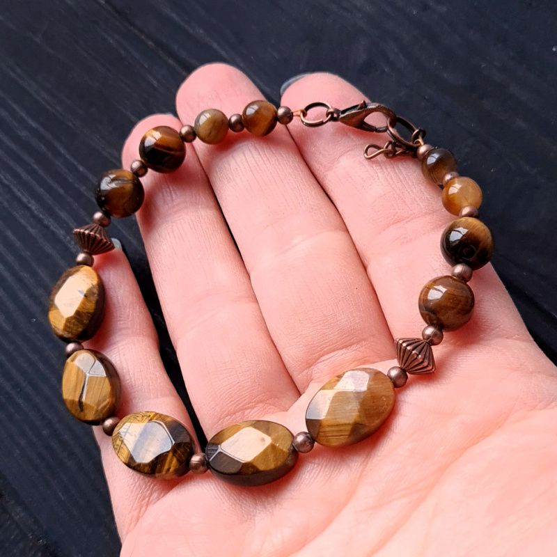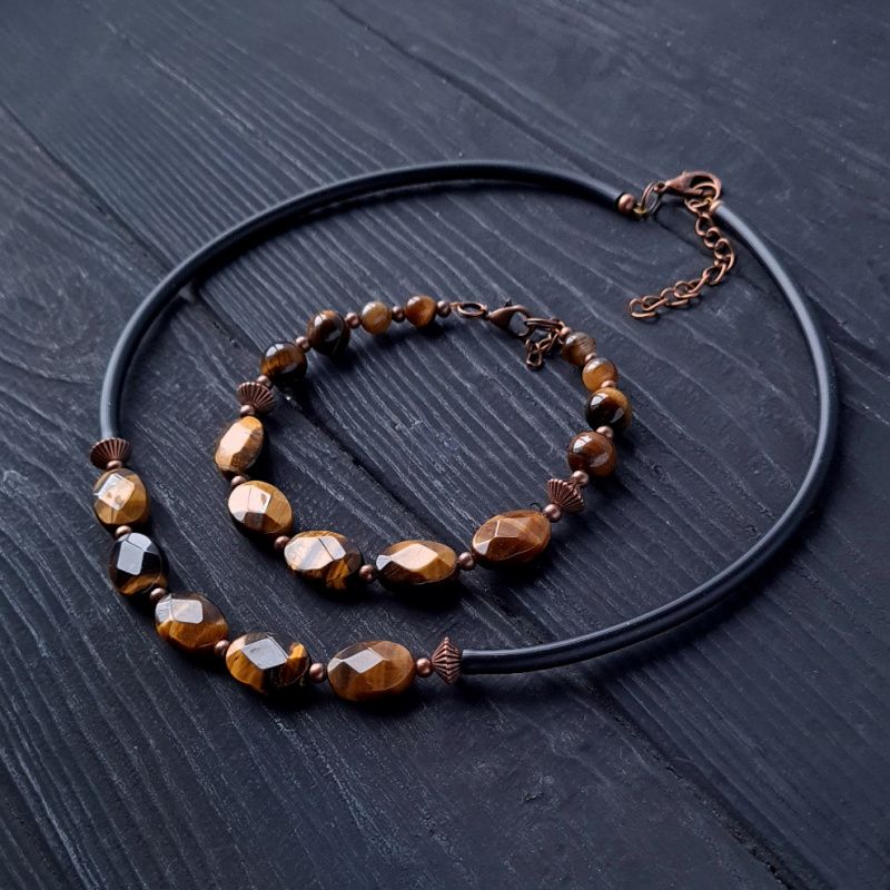 Стильный комплект украшений: чокер и браслет из натуральных камней тигриный глаз ювелирной огранки – идеальный подарок на новый год Тигра 2022. Украшения из натуральных камней тигриного глаза дополнят праздничный образ вашей любимой женщины, жены, девушки, мамы. На камнях встречаются крапинки, рисочки, ямки- что является подтверждением натуральности камней, и придает украшениям особый неповторимый шарм. Стоимость указана за комплект: чокер как на фото, длиной 40 см и браслет, длиной до 18 см. У чокер и браслет установлена удлинительная цепочка, чтобы вы могли самостоятельно регулировать их длину. Я могу сделать для вас любую другую длину, нужную вам. Стоимость будет перечислена согласно требуемой вам длине. Есть продажа прикас отдельно.