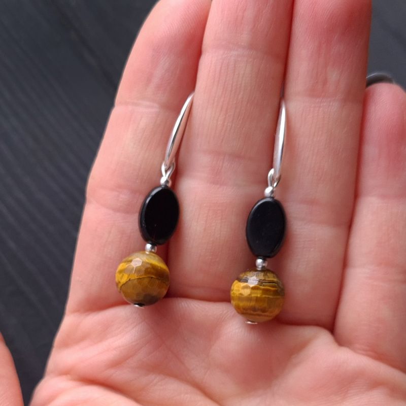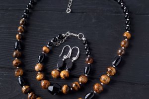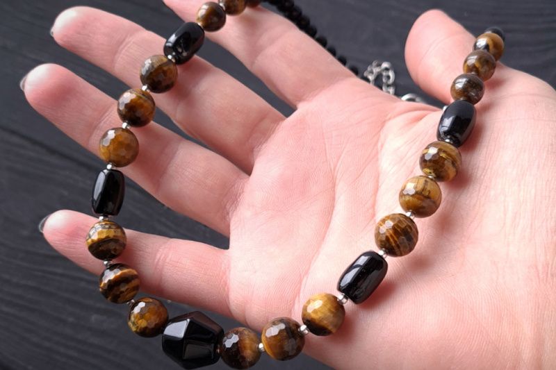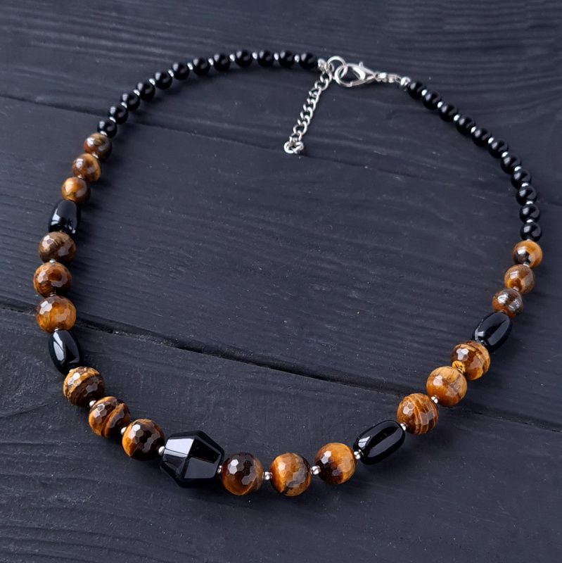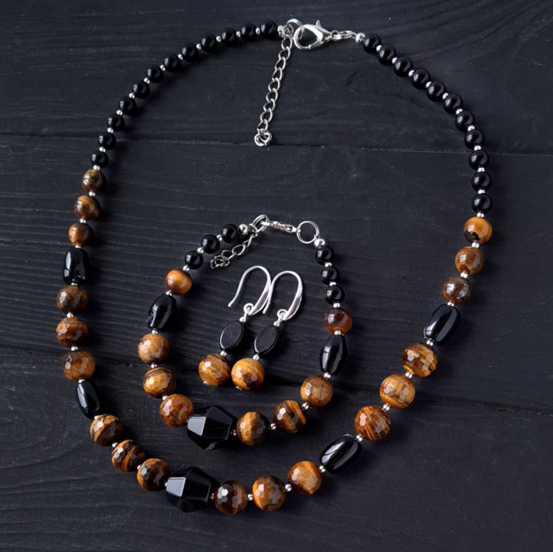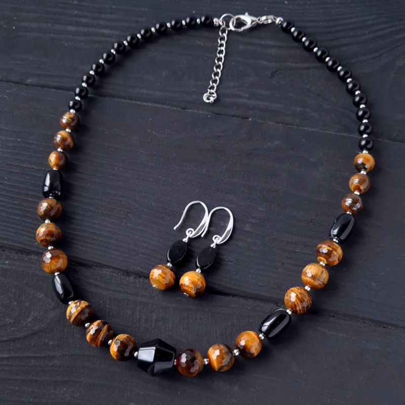 Стильный комплект украшений: бусы и серьги из натуральных камней тигриный глаз ювелирной огранки и черный агат – идеальный подарок на новый год Тигра 2022. Украшения из натуральных камней тигриного глаза дополнят праздничный образ каждой женщины, жены, девушки, мамы. На камнях встречаются крапинки, рисочки, ямки- что является подтверждением натуральности камней, и придает украшениям особый неповторимый шарм. Застежки сережек – серебро 925 пробы. Классическое сочетание черного, коричневого и золотого – для женщины, которая любит лаконичность и четкость форм. Стоимость указана за комплект: бусы как на фото, длиной 45 см и серьги. В бусы установлена удлинительная цепочка плюс 5 см, чтобы вы могли самостоятельно регулировать ее длину. Я могу сделать для вас любую другую длину ожерелья, необходимую вам. Стоимость будет перечислена согласно требуемой вам длине. На других фото есть браслет, не входящий в стоимость, но может быть заказан отдельно.