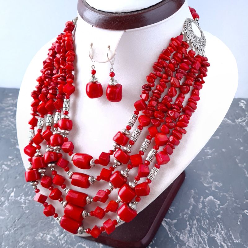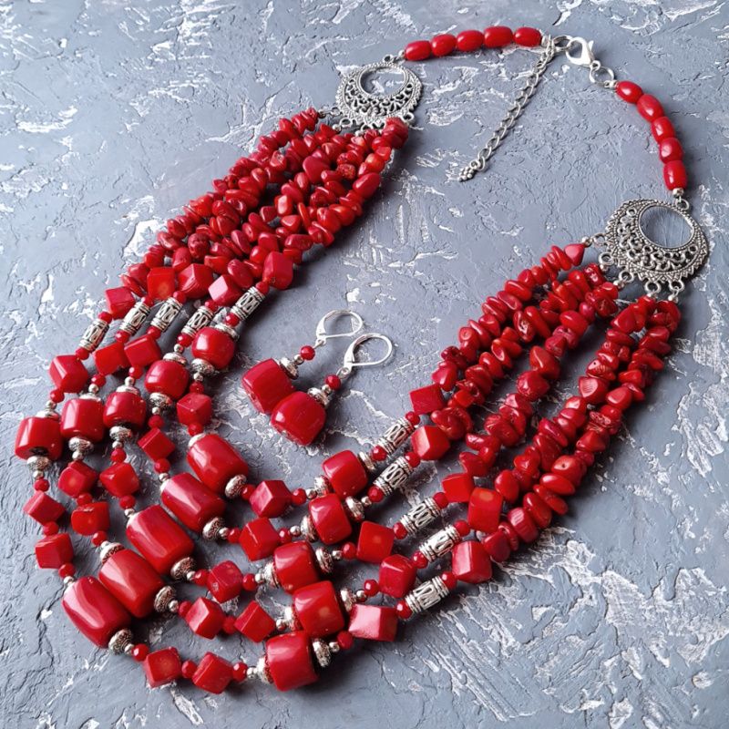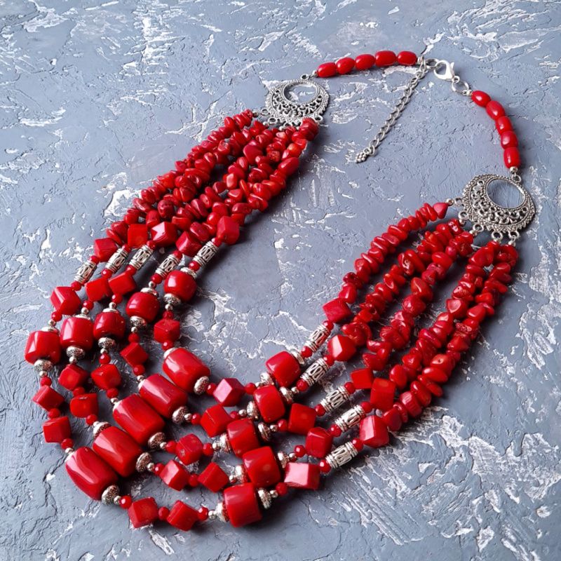 Ожерелье пятирядне из натуральных кораллов и граненых хрустальных бусинок. Красивое ожерелье под вышиванку, белую или черную блузку, платье или даже обычную рубашку - прекрасный подарок вашей женщине, жене, подруге, маме, сестре на день рождения или коралловая свадьба. Стоимость указана за комплект: бусы, длиной верхней ряда: 48 см, плюс 2-3 см каждая следующая ряд. На конце бусы есть удлиняющий цепочку +5 см, чтобы вы самостоятельно могли регулировать длину ожерелья. По заказу могу сделать любую другую, нужную вам длину. Стоимость будет перечислено по нужной вам длины. Серьги на других фото не входят в стоимость, но могут быть заказаны отдельно. На последнем фото есть праздничный футляр из натурального дерева, который не входит в стоимость, но может быть заказан отдельно.