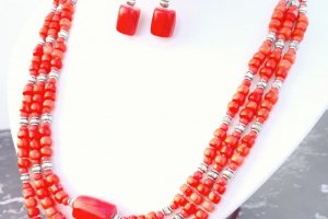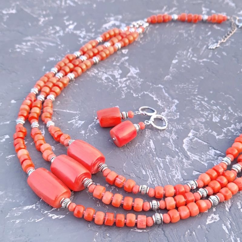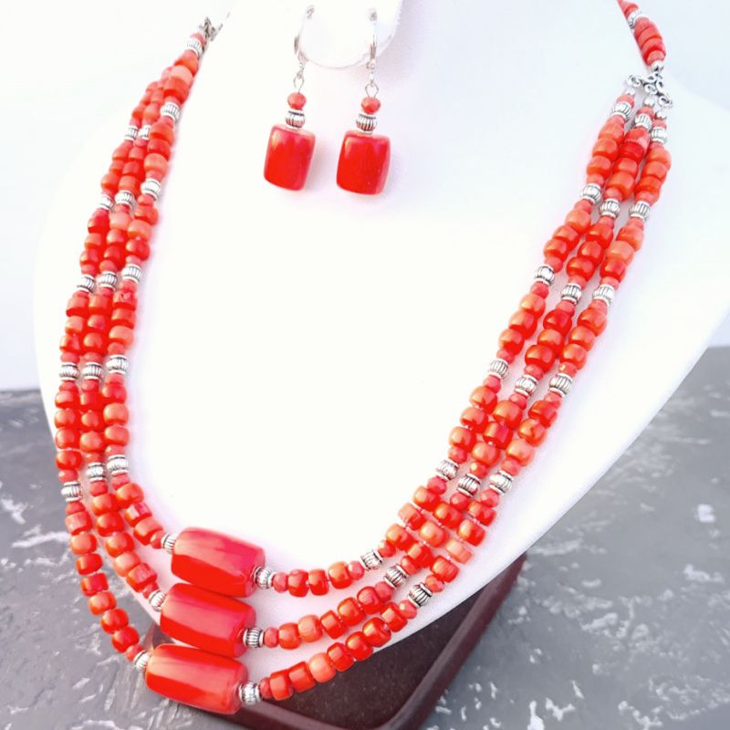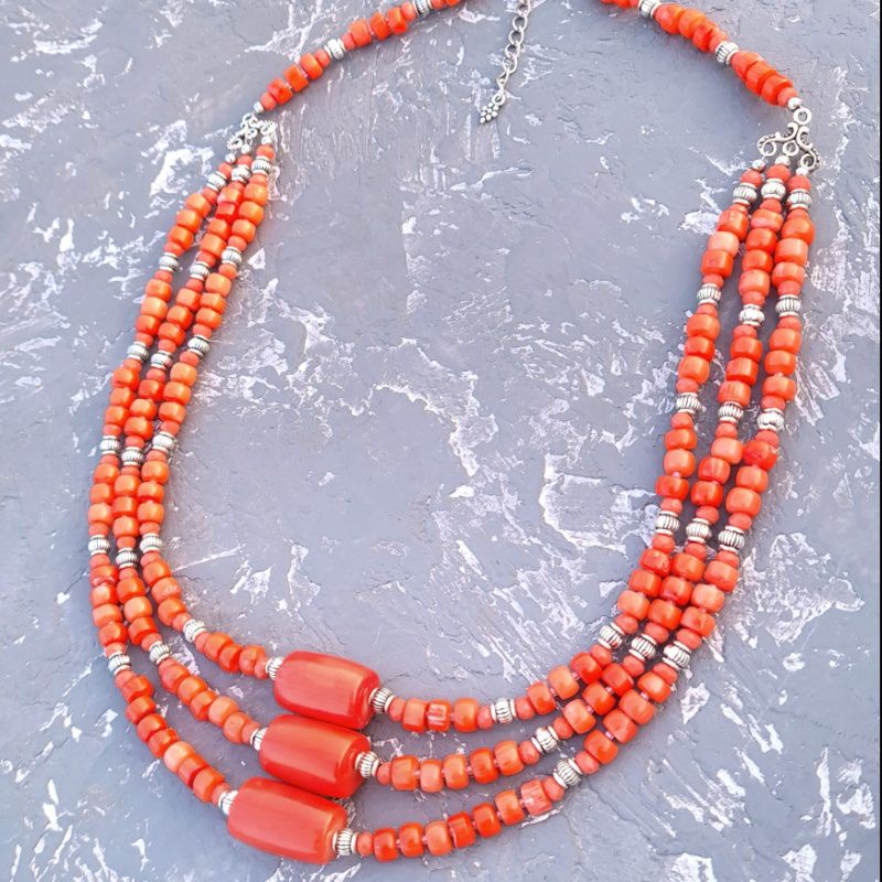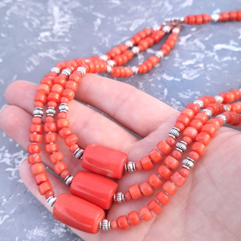 Ожерелье трехрядной из натуральных кораллов "Наследие-2" В ожерелье по центру использованы натуральные кораллы формы "бочонок" длиной 18-20 мм, а также другие бусинки все, кроме граненых хрустальных есть из натурального коралла. На камне есть дырочки и крапинки, что как раз и подтверждают натуральность, а также придают особое аутентичного шарма украшениям, сделанные под старину. Стоимость указана за комплект, как на фото, ожерелье длиной 45 см по обхвату шеи + 1-2 см каждая следующая ряд плюс ланцюжок- удлинитель 5 см, что позволяет регулировать длину. По заказу я делаю любую длину ожерелья, нужную вам. Стоимость будет пересчитана в соответствии с нужной вам длины. На других фото есть серьги, не входящих в стоимость и данные для примера. Вы также можете заказать их в комплект к ожерелью. На последнем фото есть праздничный футляр из натурального дерева, который не входит в стоимость, но может быть заказан отдельно.