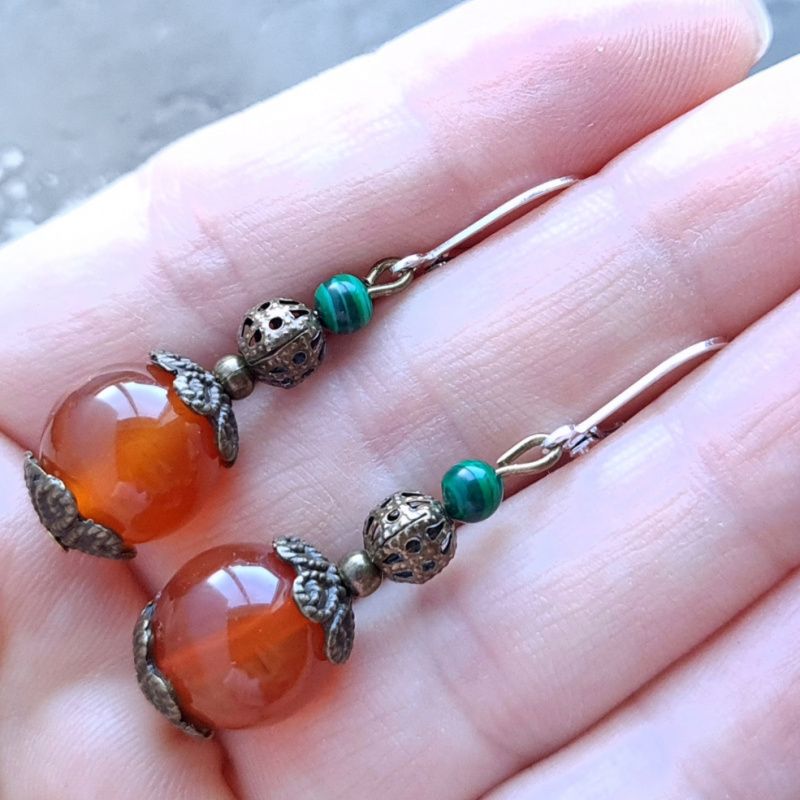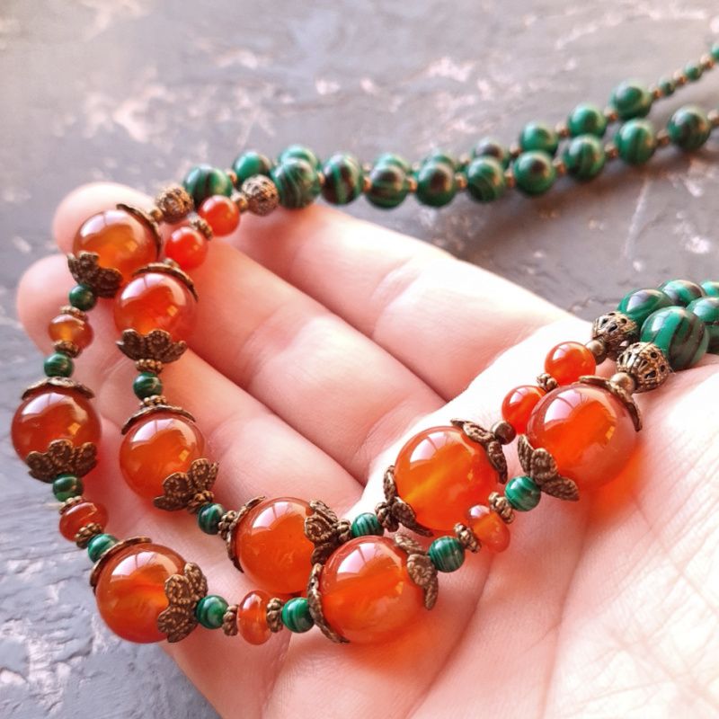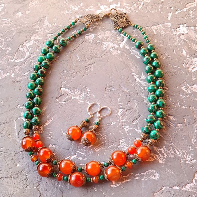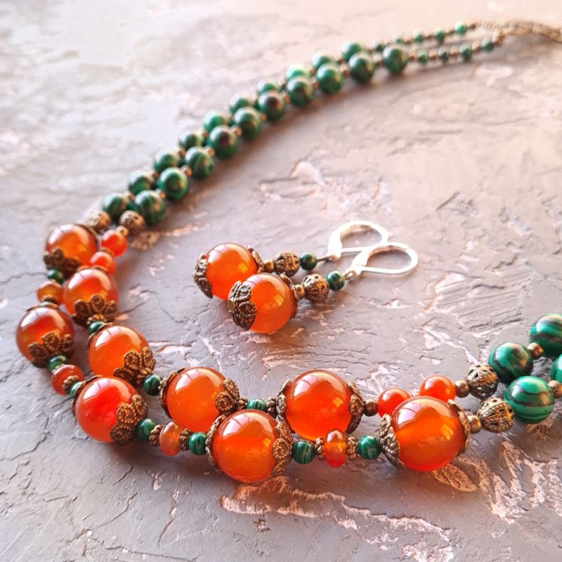 Ожерелье двухрядное и серьги с натуральным сердоликом и малахитом. Стоимость указана за бусы как на фото, длиной: верхняя ряд - 40 см; нижняя ряд - 43 см + удлиняющий цепочка 5 см, и серьги. По заказу я делаю любую длину ожерелья, нужную вам. Длина согласуется после оформления покупки. Серьги с застежками из серебра 925 пробы. К бусы в комплект также могу сделать браслет по вашим пожеланиям. На последнем фото есть праздничный футляр из натурального дерева, который не входит в стоимость, но может быть заказан отдельно.