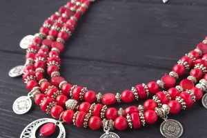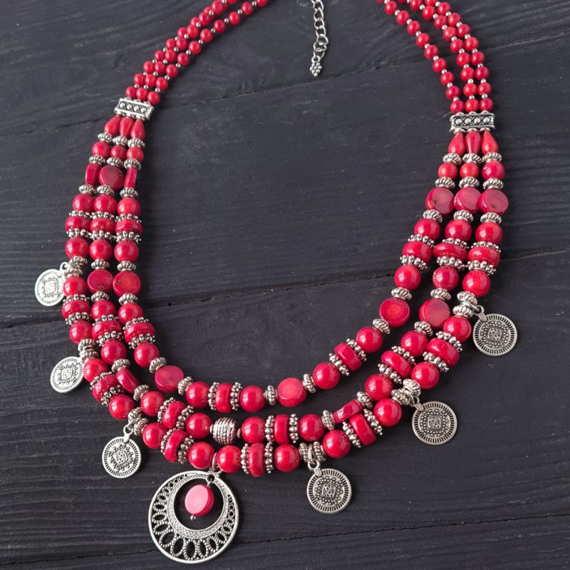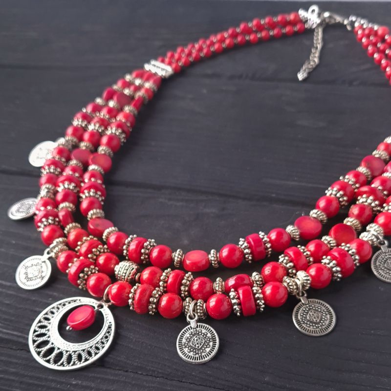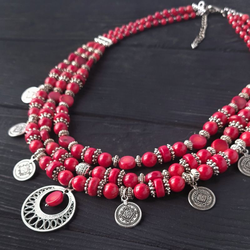 Трехрядной ожерелье из натуральных кораллов сделано в стиле старинных украинских женских украшений, украшенное подвесками в цвете черненого капельного серебра. На кораллах есть черные крапинки и черточки, и является признаком натуральности, что придает особый шарм украшениям и ощущение "живого" камня. Если вам нужно "идеальное" намисто- заказывайте его с имитации коралла или стеклянных намиистин. Длина ожерелья согласовывается при оформлении покупки. Стоимость указана с учетом базовой длины ожерелья как на фото, по охвату шеи 45 см + 5 см удлиняющий цепочку. Каждый следующий ряд 2 см. Если вам нужна другая длина - стоимость будет пересчитана в соответствии с нужной длины.