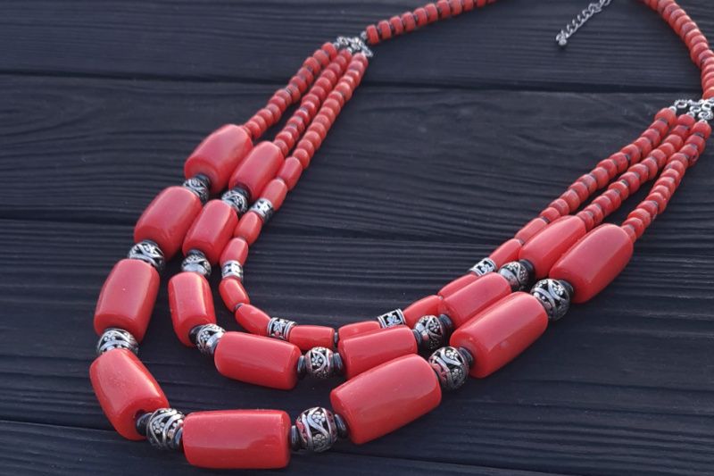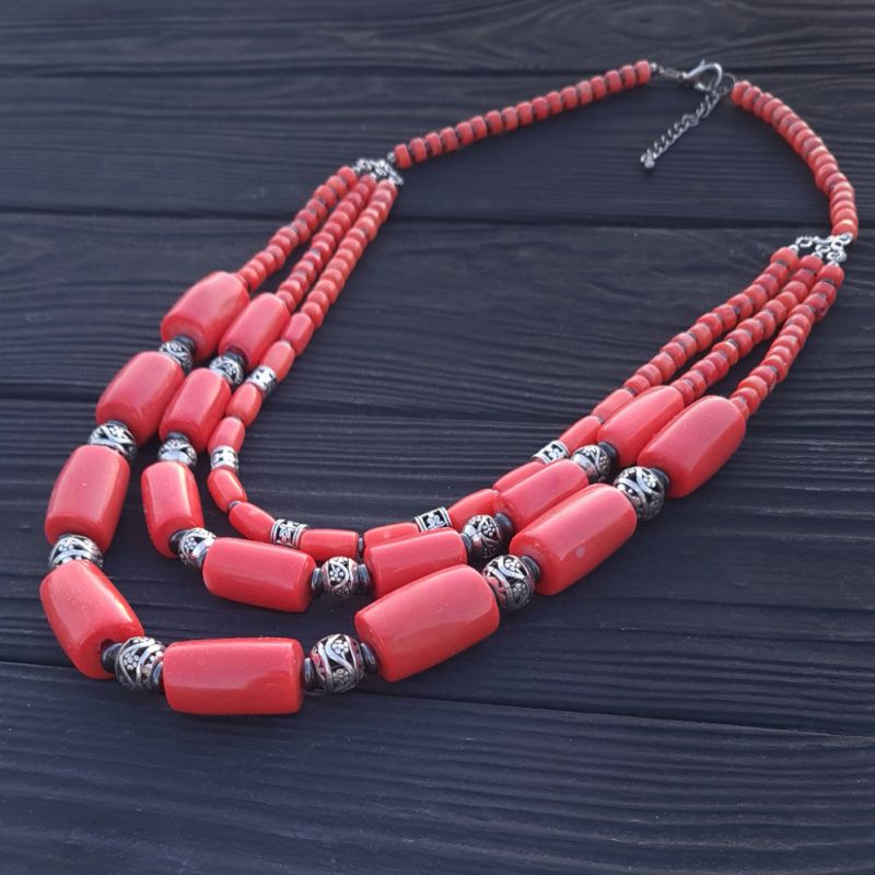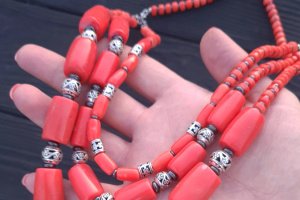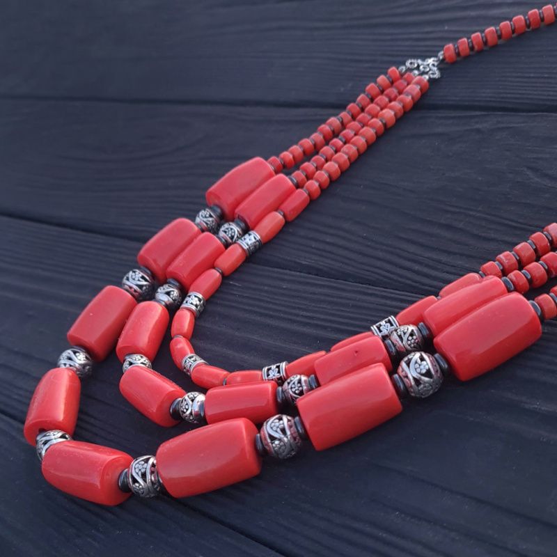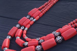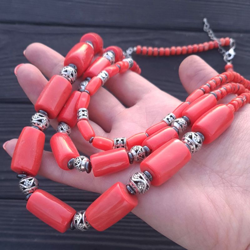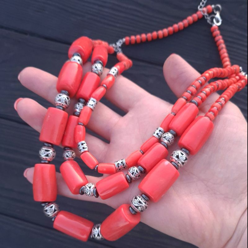 Ожерелье трехрядное из натуральных кораллов спокойного не яркого цвета лосось. На камне есть дырочки и крапинки, что и подтверждают натуральность, а также придают особый аутентический шарм украшениям, сделанным под старину. Стоимость указана за ожерелье, как на фото, ожерелье длиной 45 см по охвату шеи + 2 см каждый последующий ряд плюс цепочка-удлинитель 5 см, что позволяет регулировать длину. По заказу я делаю любую длину бусы, нужную вам. Стоимость будет перечислена в соответствии с требуемой вам длиной. Вы также можете заказать в комплект бусы серьги или браслет.