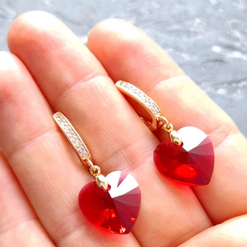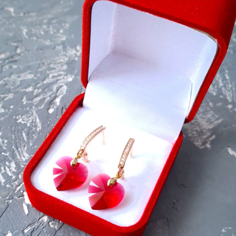 Серьги с кристаллами Swarovski цвета Scarlet. Такие серьги в форме сердца станут прекрасным подарком вашей любимой девушке, подруге, жене или маме на 8 марта, юбилей день рождения или любой другой праздник. Есть другие цвета кристаллов на выбор. Застежки сережек - английский замок, позолота, медицинский сплав, не вызывает аллергии или раздражения. По заказу можно выбрать другой тип застежек, с кристаллами или без, а также в серебре 925 пробы. Стоимость другого варианта уточняйте. Размер сердец: 14 мм. На других фото также кулон на цепочке, не входит в стоимость, но может быть заказан отдельно. Также в сережек можно заказать ожерелье, кулон на цепочке, браслет или колье с кристаллами Swarovski в форме сердца. Праздничный бархатный футляр на последнем фото - в подарок в комплект!
