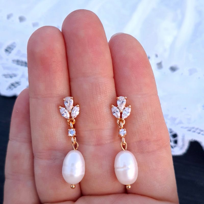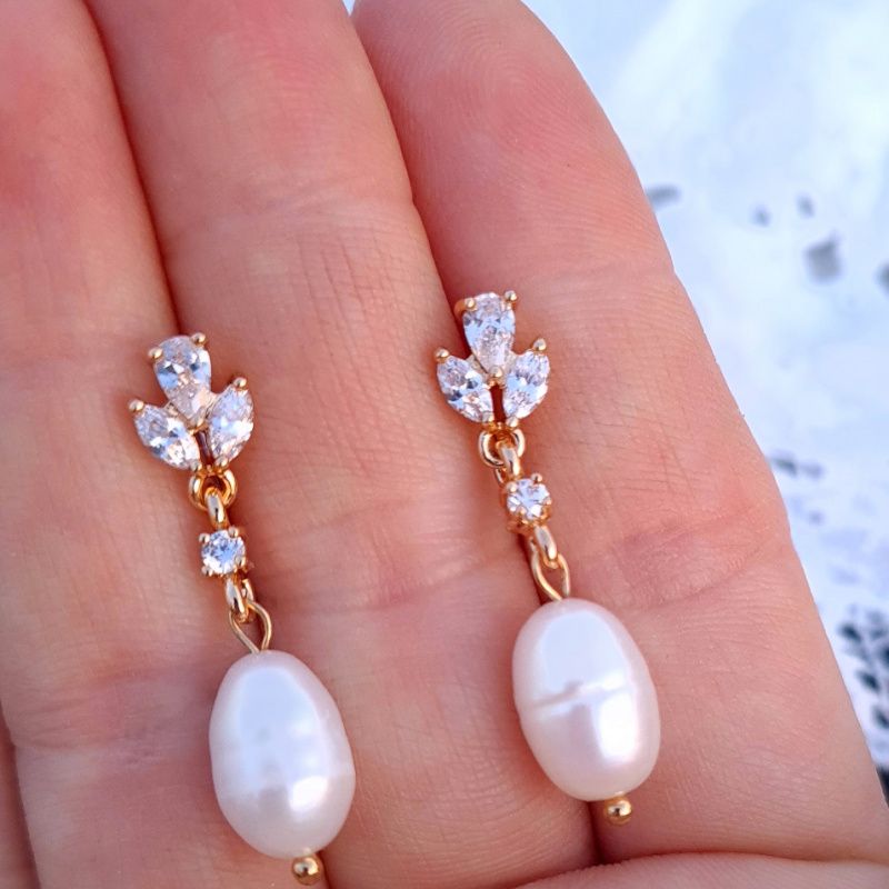 Роскошные позолоченные серьги с натуральными удлиненными жемчужинами и кристаллами циркона. Застежки сережек - гвоздик, позолота по латуни. На других фото есть колье из жемчуга, не входит в стоимость и дано для примера. Вы также можете заказать колье или браслет в комплект к серьгам.
