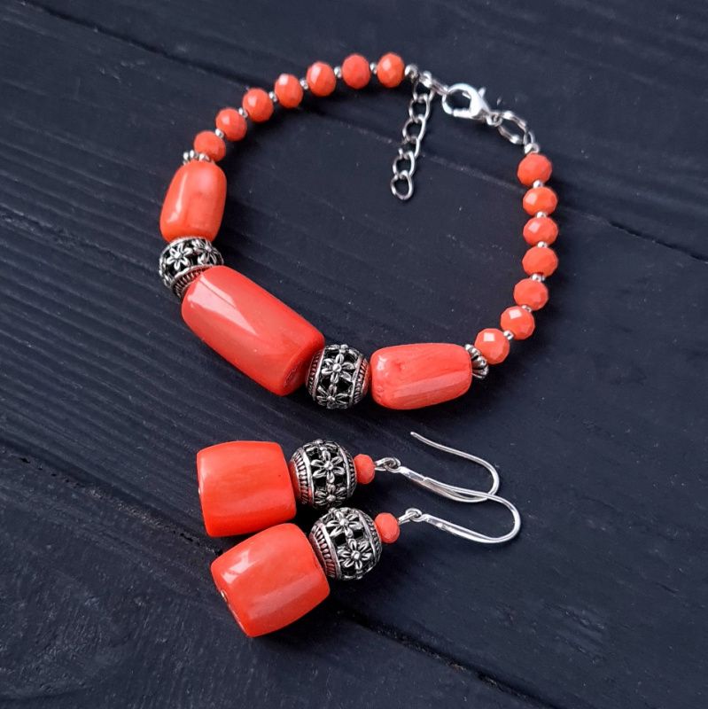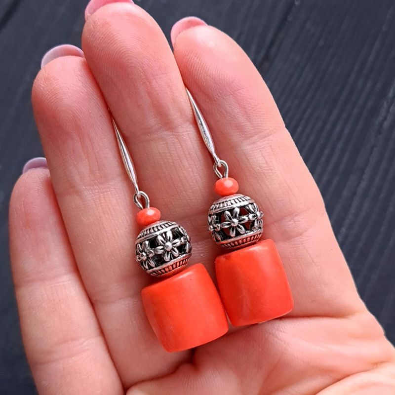 Серьги из натуральных кораллов формы "бочечка" цвета лосось, и бусинами с цветочным орнаментом. Застежки сережек – серебро 925 пробы. Длина серьг: 47 мм. На других фото есть браслет, не входящий в стоимость, но может быть заказан отдельно. Вы также можете заказать ожерелье или кулон к серьгам - по вашему вкусу.