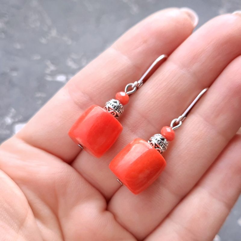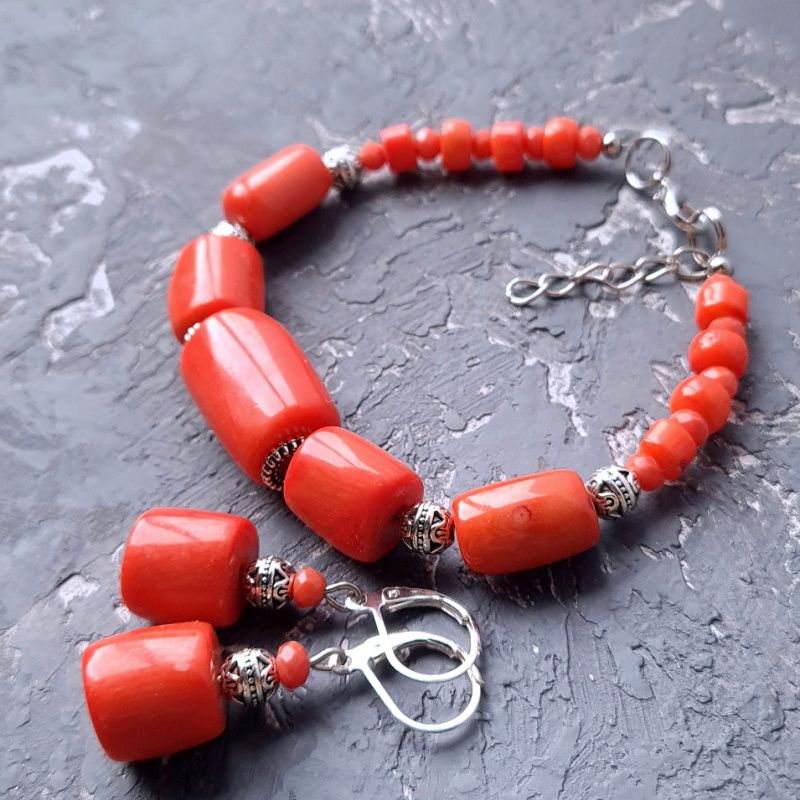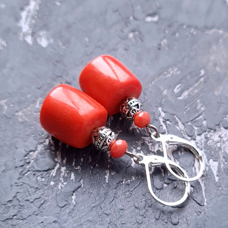 Серьги с натуральными кораллами формы "бочонок" цвета лосось, и бусинами с орнаментом. Застежки сережек - серебро 925 пробы. Длина сережек 40 мм. На других фото есть браслет, не входит в стоимость, но может быть заказан отдельно. Вы также можете заказать ожерелье, браслет или кулон в сережек - на ваш вкус.
