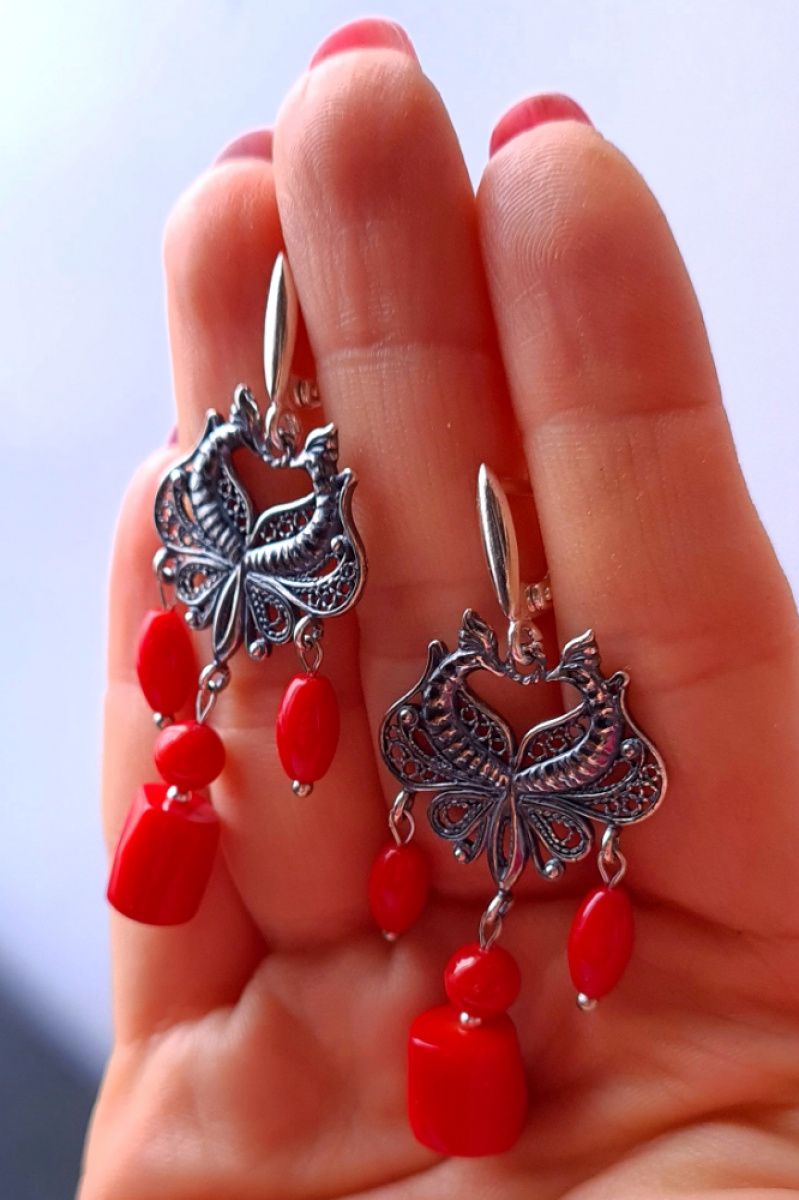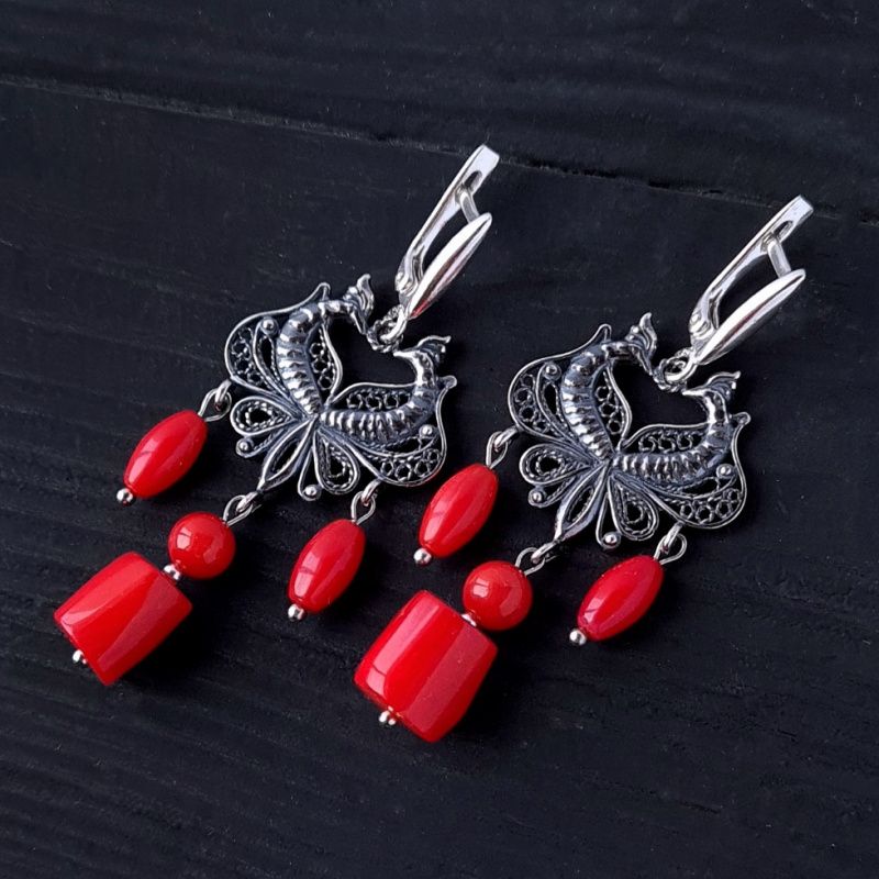 Серебряные серьги с натуральными кораллами высокого класса. Серебро украинского производства, заводское. Можно на заказ выбрать серебро с чернением, как на фото или без (будет светлый цвет серебра). Застежки серег: английский замок. Длина серьг: 55 мм. На других фото есть бусы. что не входит в стоимость, но может быть заказано отдельно. Вы также можете заказать ожерелье, браслет или кулон для серьг - по вашим пожеланиям.