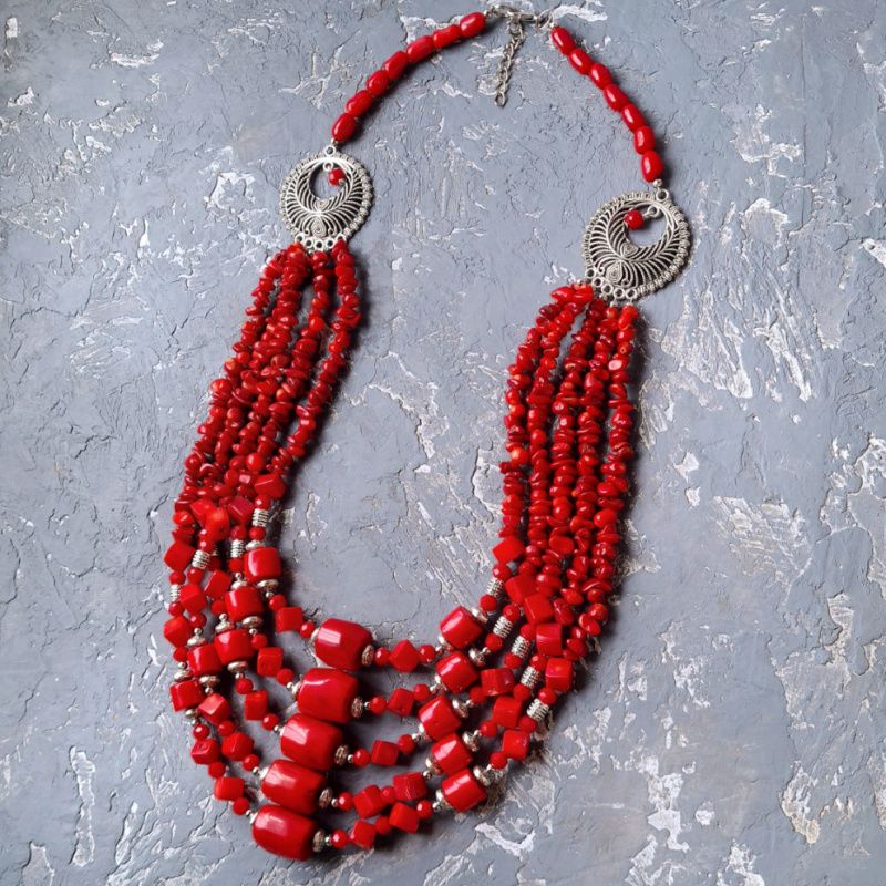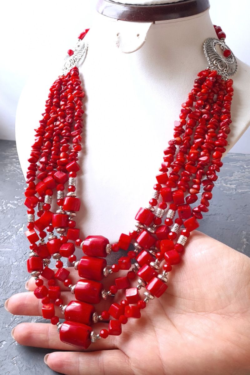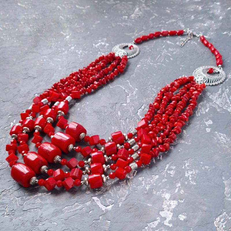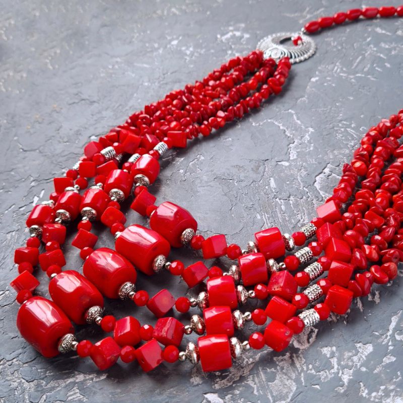 Ожерелье пятирядне из натуральных кораллов и граненых хрустальных бусинок. Красивое ожерелье под вышиванку, белую или черную блузку, платье, джинсовую или белую рубашку в стиле бохо, или даже обычную классическую рубашку. Ожерелье из красных кораллов - прекрасный подарок вашей женщине, жене, подруге, маме, сестре на день рождения или коралловая свадьба. Стоимость указана за комплект: бусы, длиной верхней ряда: 55 см, плюс 2-3 см каждая следующая ряд. На конце бусы есть удлиняющий цепочку +5 см, чтобы вы самостоятельно могли регулировать длину ожерелья. По заказу могу сделать любую другую, нужную вам длину: короткую или длинную. Стоимость будет перечислено по нужной вам длины. К бусы на заказ могу сделать браслет или серьги.