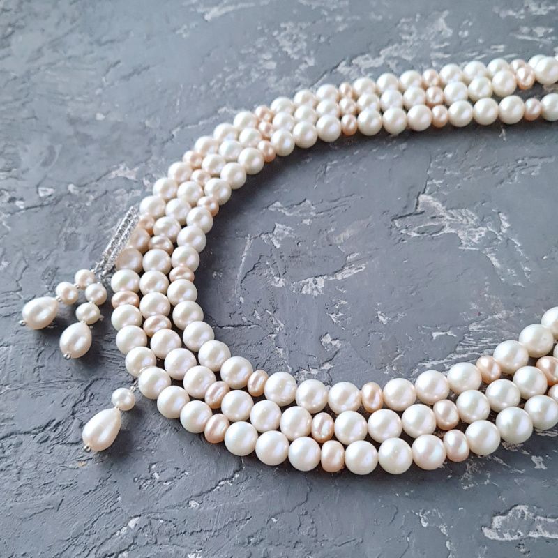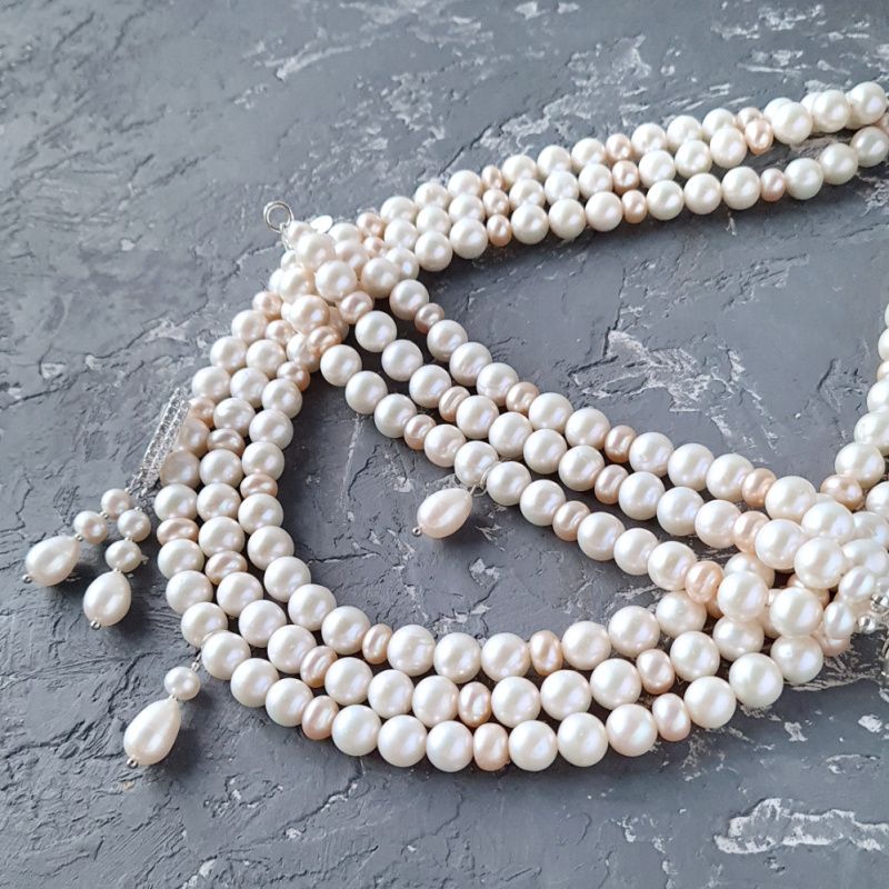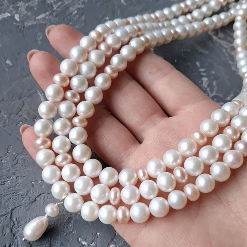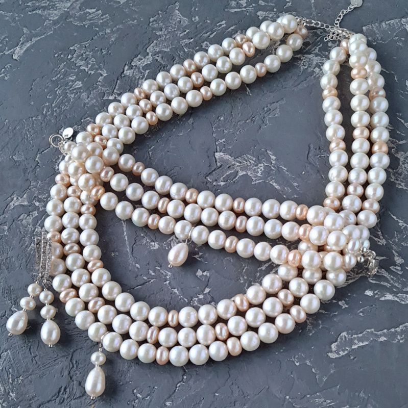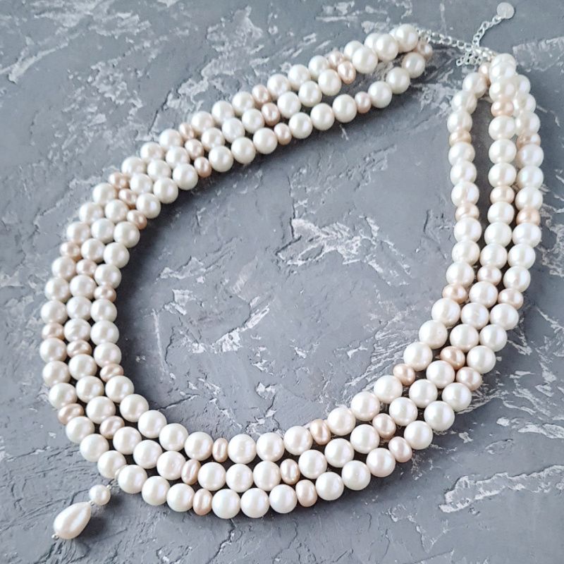 Праздничное или свадебное колье из натуральных белых и персиковых жемчуга в серебре. По заказу могу также сделать аналогичное колье только из белого жемчуга. Стоимость уточняйте. Фурнитура: серебро 925 пробы. В подвеске красивые удлиненные жемчужины в форме капли, высокого качества и класса. Стоимость указана за колье как на фото. Размер круглых жемчужин в ожерелье: 8-7 мм (по центру - крупные, на концах - меньше). Колье, длиной 40 см по обхвату шеи, плюс 5 см удлиняющий цепочку, с помощью которого можно регулировать длину до 5 см. На заказ я делаю любую длину, необходимую заказчику. Стоимость будет перечислено в соответствии с нужной длины. Браслет и серьги не входящие в стоимость, но могут быть заказаны отдельно.