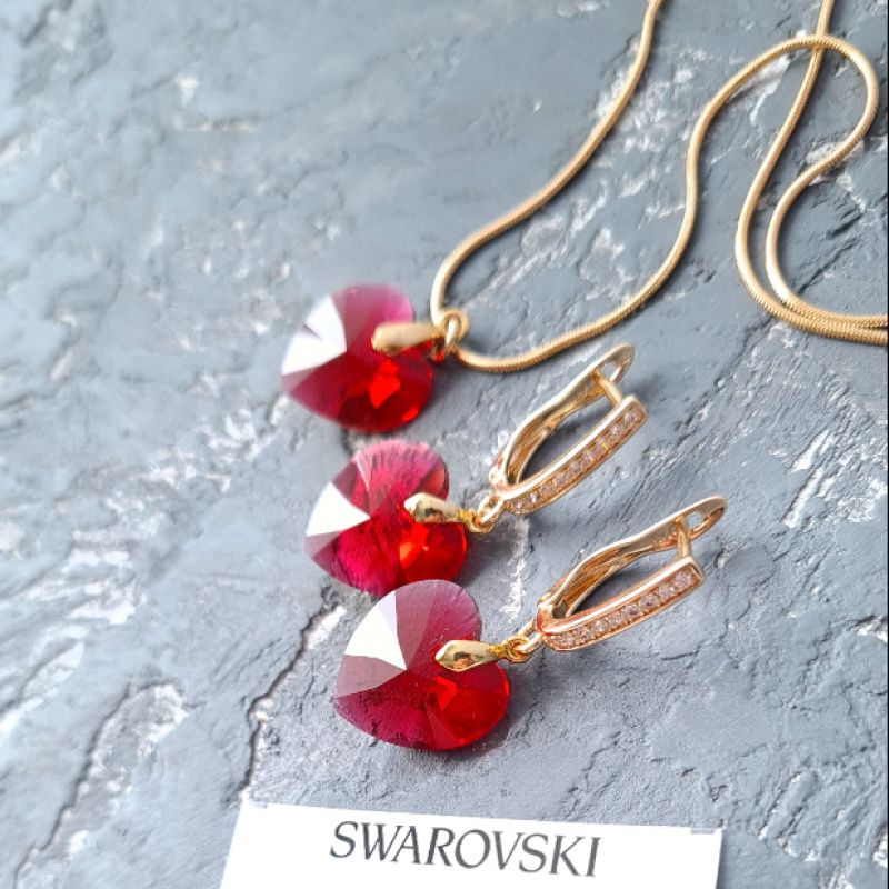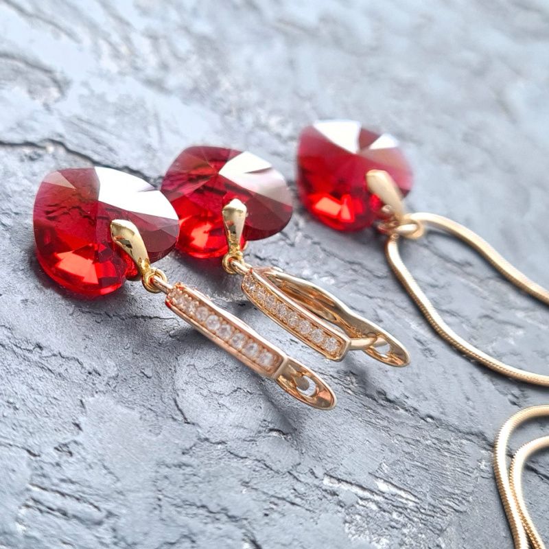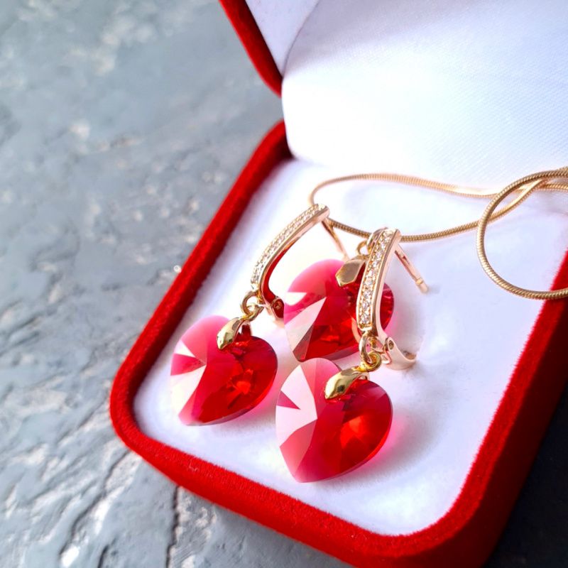 Комплект украшений: кулон на цепочке и серьги с кристаллами Swarovski в форме сердца. Такой комплект украшений станет прекрасным подарком вашей любимой девушке, подруге, жене или маме на 8 марта, юбилей день рождения или любой другой праздник. Цвет кристаллов Swarovski: Scarlet, очень интересные и красивые кристаллы, имеющие в своем составе 2 оттенка, которые плавно переходят друг в друга: красный и розовый. Есть и другие цвета кристаллов Swarovski - на выбор. Пишите в личку - дам фото. Застежки сережек - английский замок. Металл: позолота, медицинский сплав, не вызывает аллергии или раздражения. Длина сережек 35 мм. Размер сердец: 14 мм. Есть продажа украшений отдельно. В комплект могу также сделать браслет на черном каучуковом шнуре, на красивом витой красном шнуре или натуральных жемчуге. Праздничный бархатный футляр на последнем фото - в подарок в комплект!