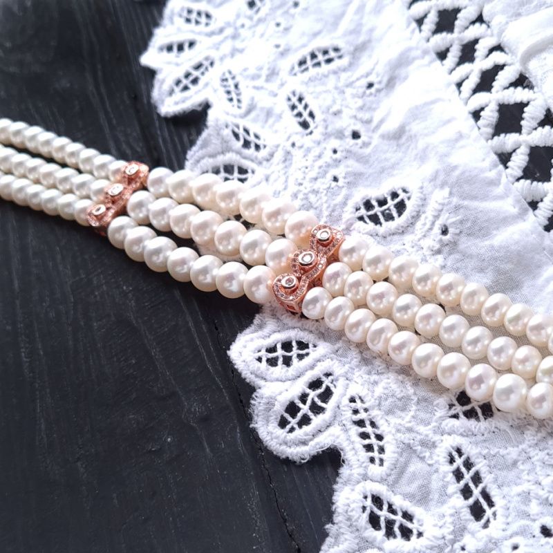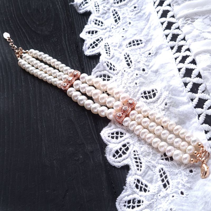 Трехрядный браслет из натурального жемчуга и кристаллов