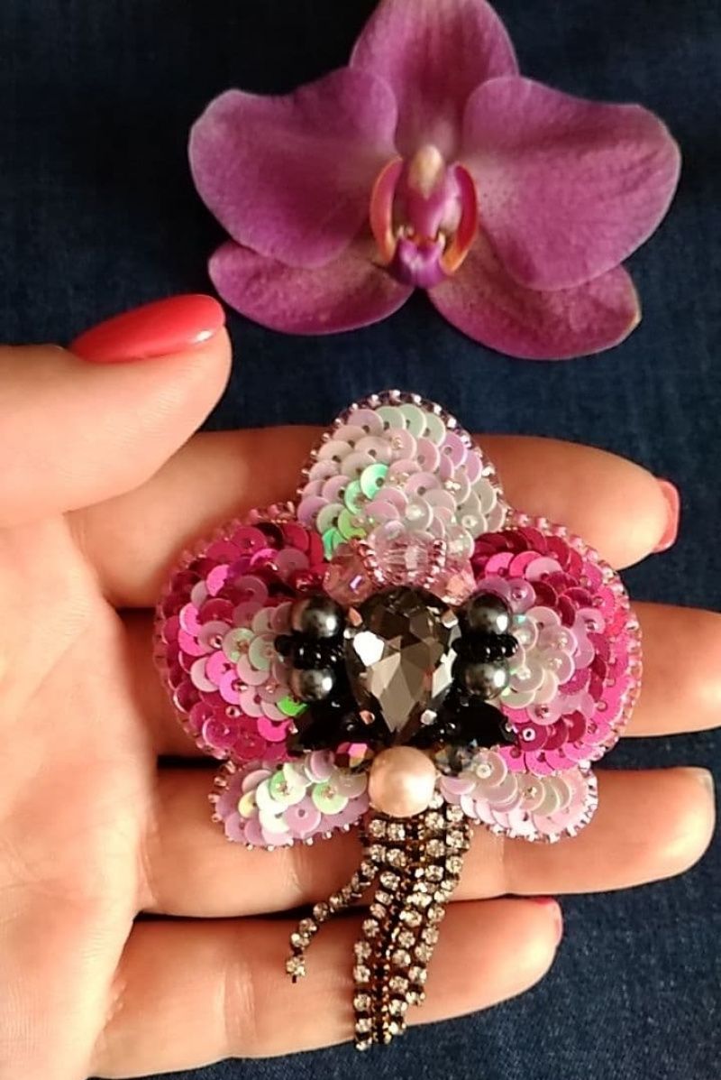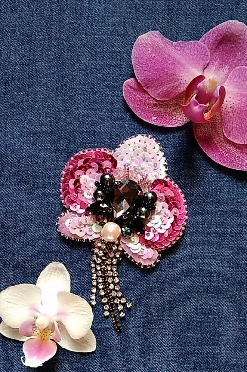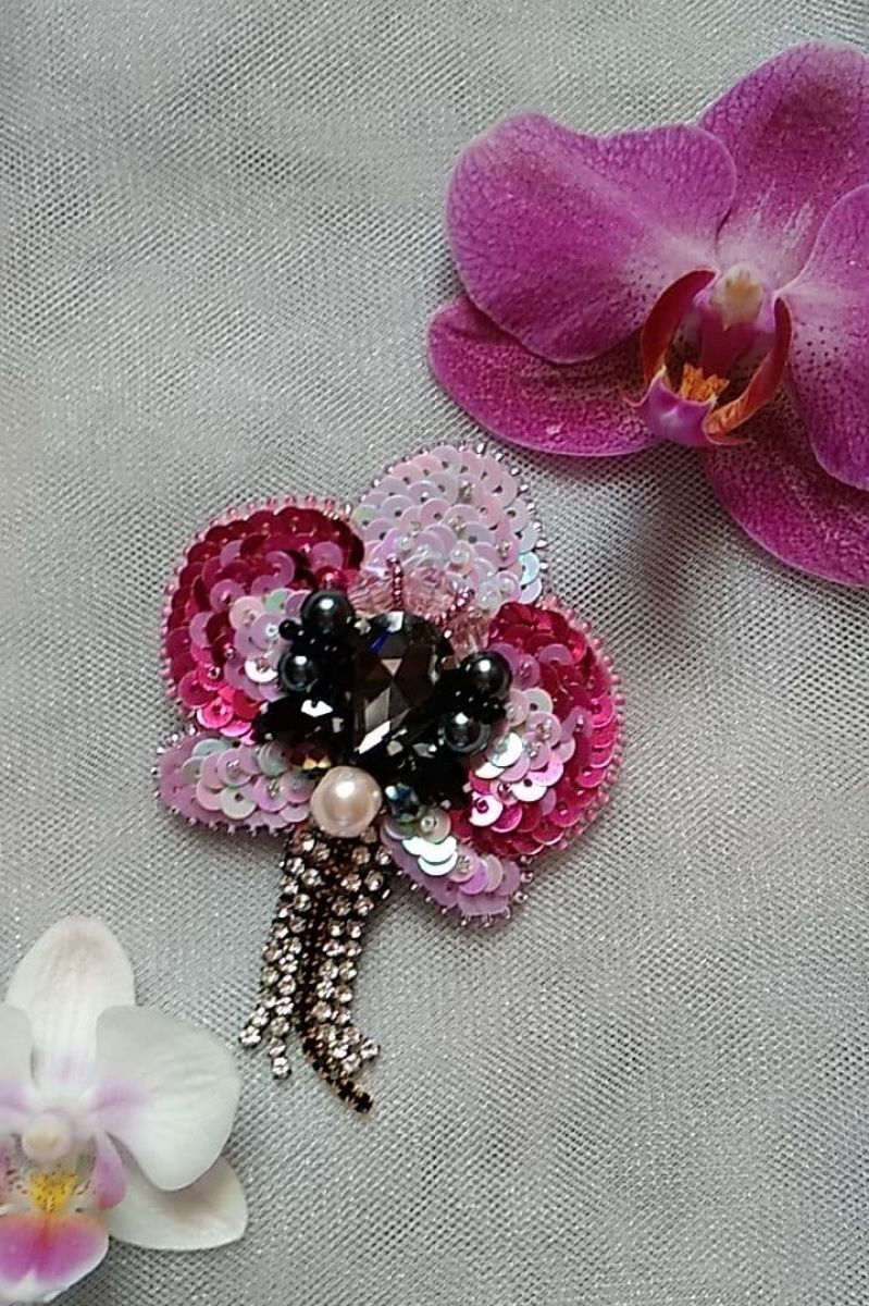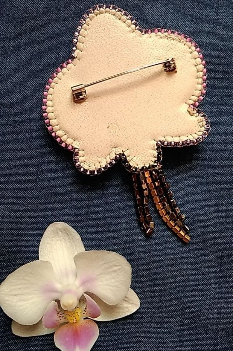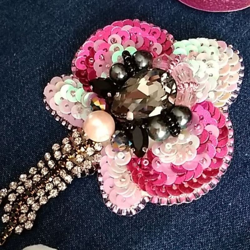 Брошка вишита пайетками з переходом від білого до насиченого рожевого. Прикрашена намистинами та бісером. Доповнена підвісками зі стразового ланцюжка що гармонійно підходять до брошки. Невелика та акуратна.