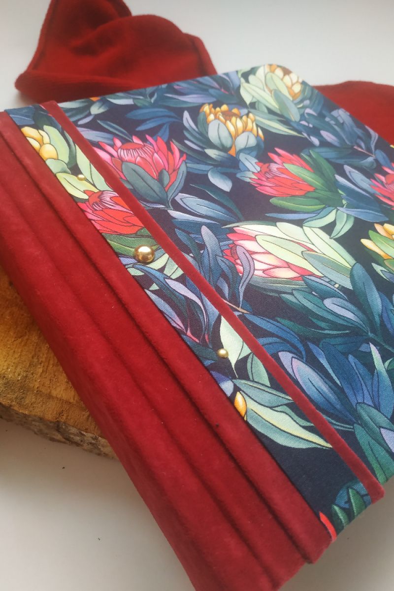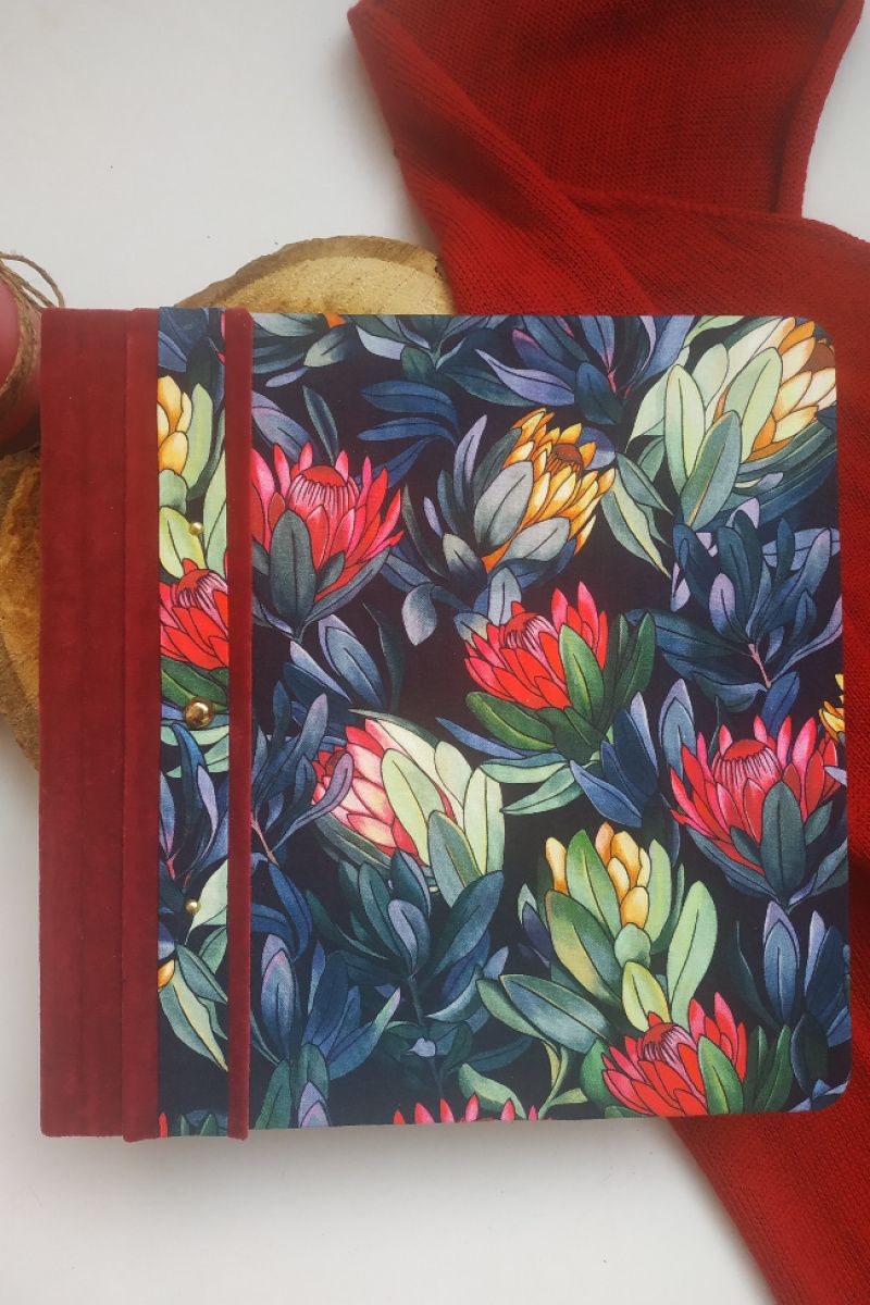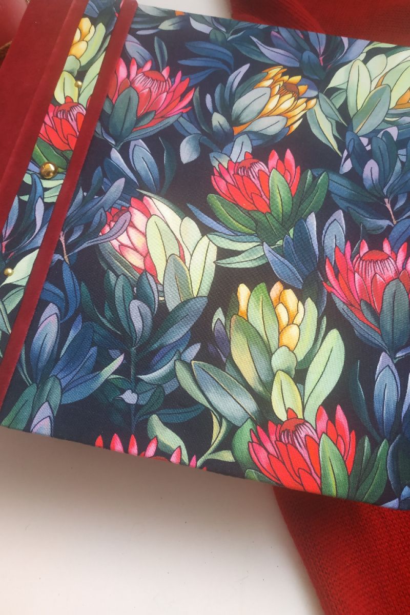 Обложка альбома обтянута миништофом и американской тканью, сочетание блока с черными плотными листами и обложки шикарного винного цвета и перекликающегося с цветами на ткани,по мнению автора, считаю идеальными. Листы плотного черного цвета между ними проложена шуршащая калька. Блок сшит таким образом, что при его заполнении фотографиями , альбом не потеряет своей нарядности. Форзацы из плотной американской дизайнерской бумаги.