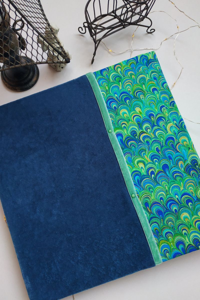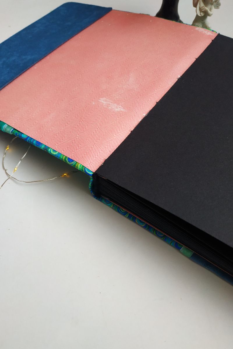 Обложка альбома обтянута миништофом и американской тканью, сочетание блока с черными плотными листами и обложки шикарного винного цвета и перекликающегося с цветами на ткани,по мнению автора, считаю идеальными. Листы плотного черного цвета между ними проложена шуршащая калька. Блок сшит таким образом, что при его заполнении фотографиями , альбом не потеряет своей нарядности. Форзацы из плотной американской дизайнерской бумаги.