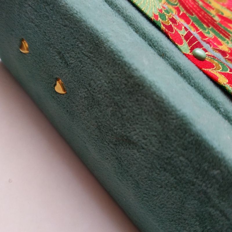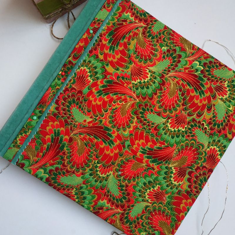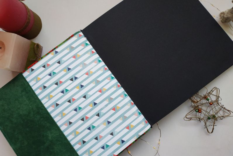 Обложка альбома обтянута миништофом мятного цвета и тканью с рисунком с золотой нитью. Страницы черного цвета, разбавлены страницами дизайнерской бумагой американского производителя.Блок сшит таким образом, что при его заполнении фотографиями , альбом не потеряет своей нарядности. На переднем форзаце есть вместительный карман с миништофа.