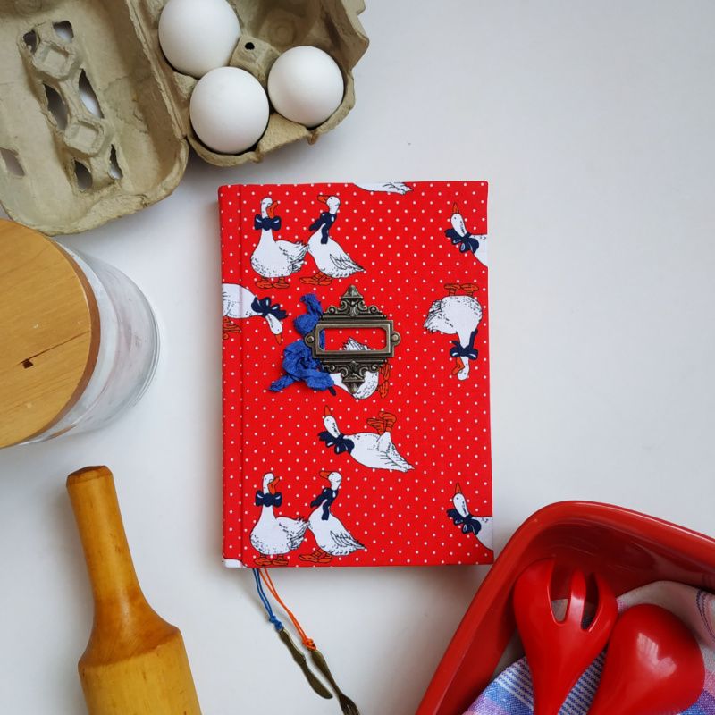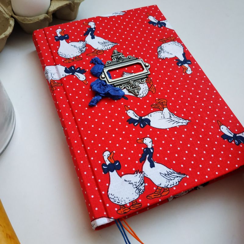 Кулинарная книга. Формат А5. Страницы пастельных цветов, разделены на категории-салаты и закуски, первые блюда, вторые блюда, десерт, консервация и праздничные блюда. На форзацах кармашки для рецептов записанных наспех. Обложка из переплетеного картона смягчена и обтянута плотным хлопком. Декор - рамочка. Закладка с металлической подвеской.