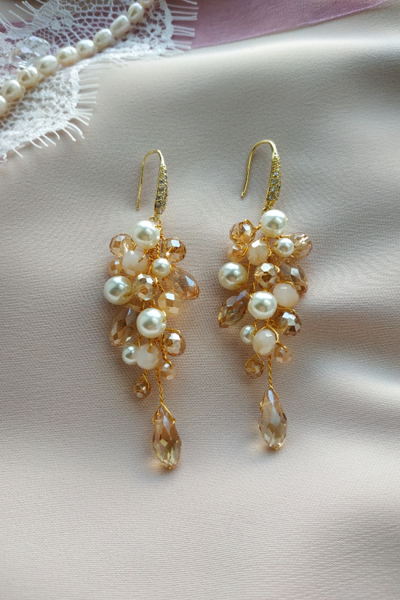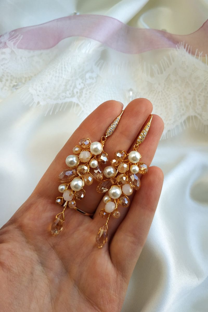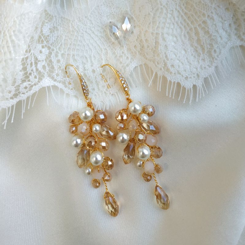 Виготовлені сережки з кришталевих намистин кольору шампань, скляного жемчуга, ювелірного дроту золотого кольору із захисним покриттям, швензи з позолотою 24К з фіанітами.
